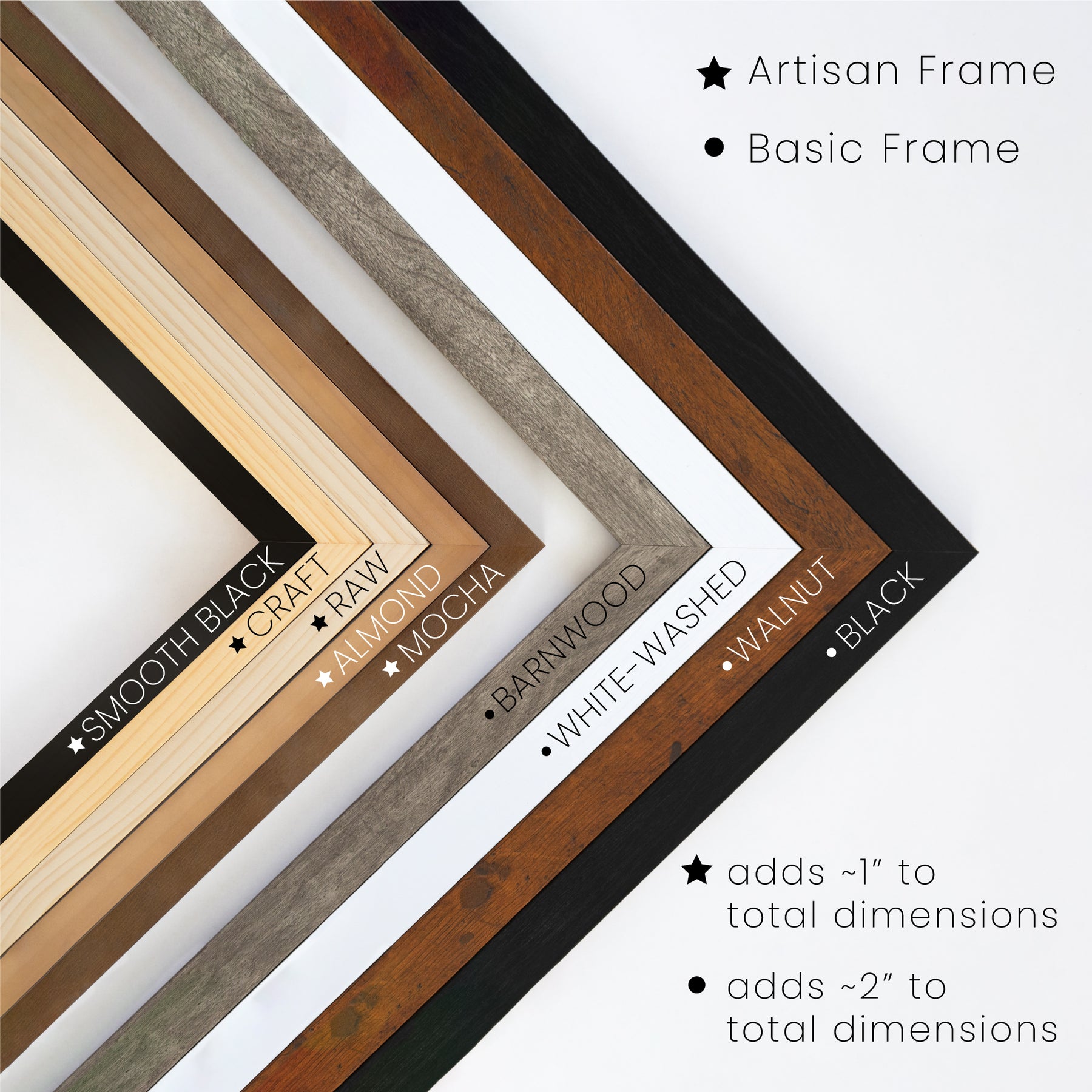 Frame Options: Artisan (Solid Wood): Mocha, Almond, Raw, Craft. Basic (MDF): Barnwood, White-Washed, Walnut, Black.