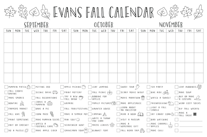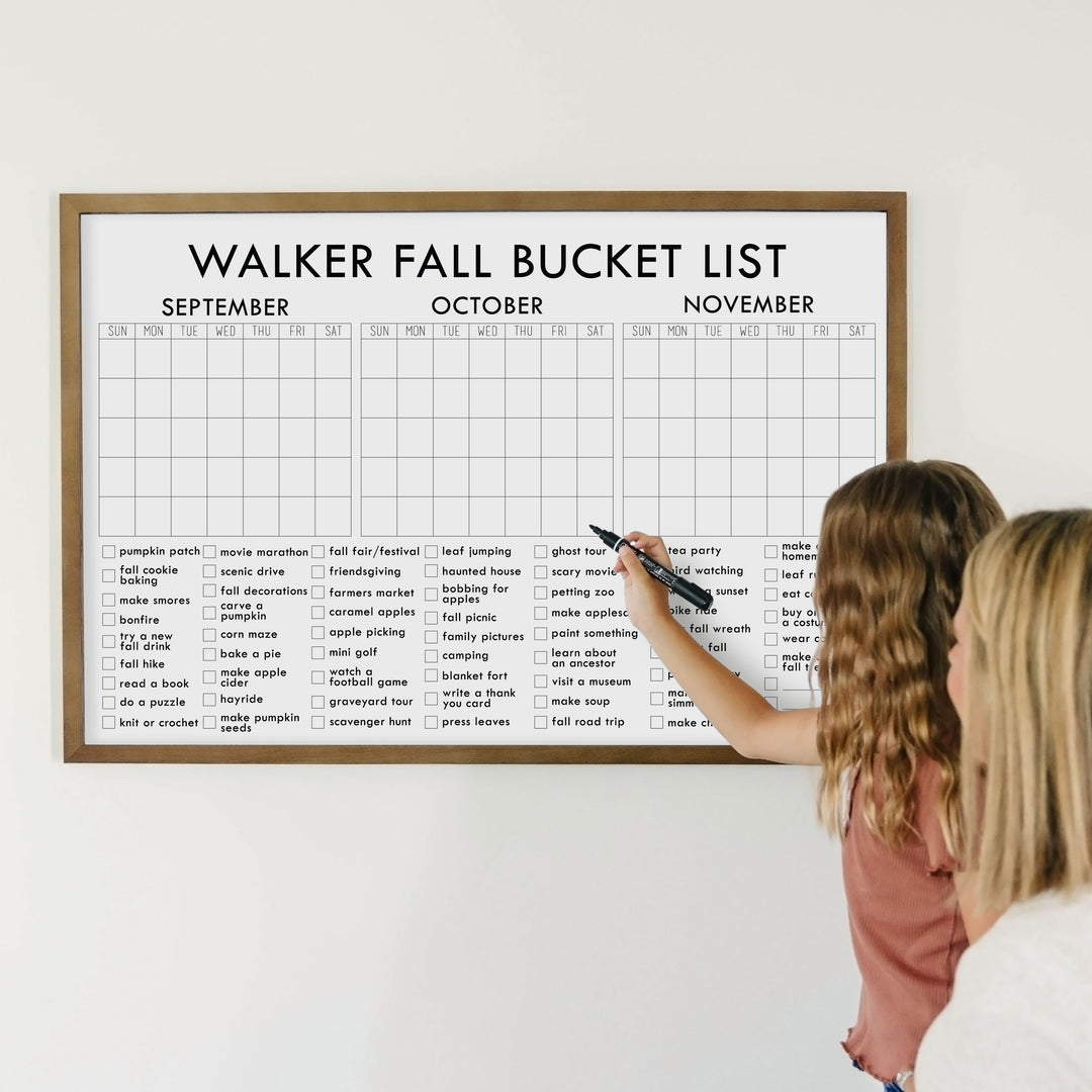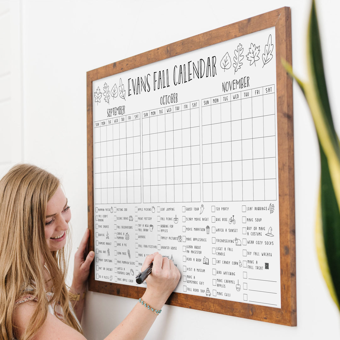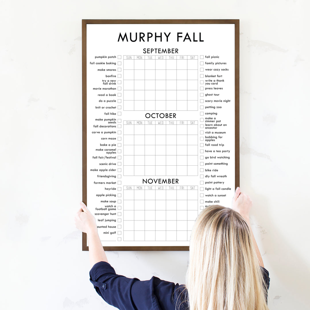 Plan the perfect fall season with our Fall Bucket List Collection. This collection includes reusable framed dry-erase boards featuring 3 calendar months with fall-themed activities to check off your bucket list. We also have a large coloring fall bucket list option. Check off activities like baking pies, jumping in leaves, and visiting pumpkin patches as you create unforgettable memories with your family. Perfect for planning your family fall activities - whether you're a couple or have a bunch of kiddos!