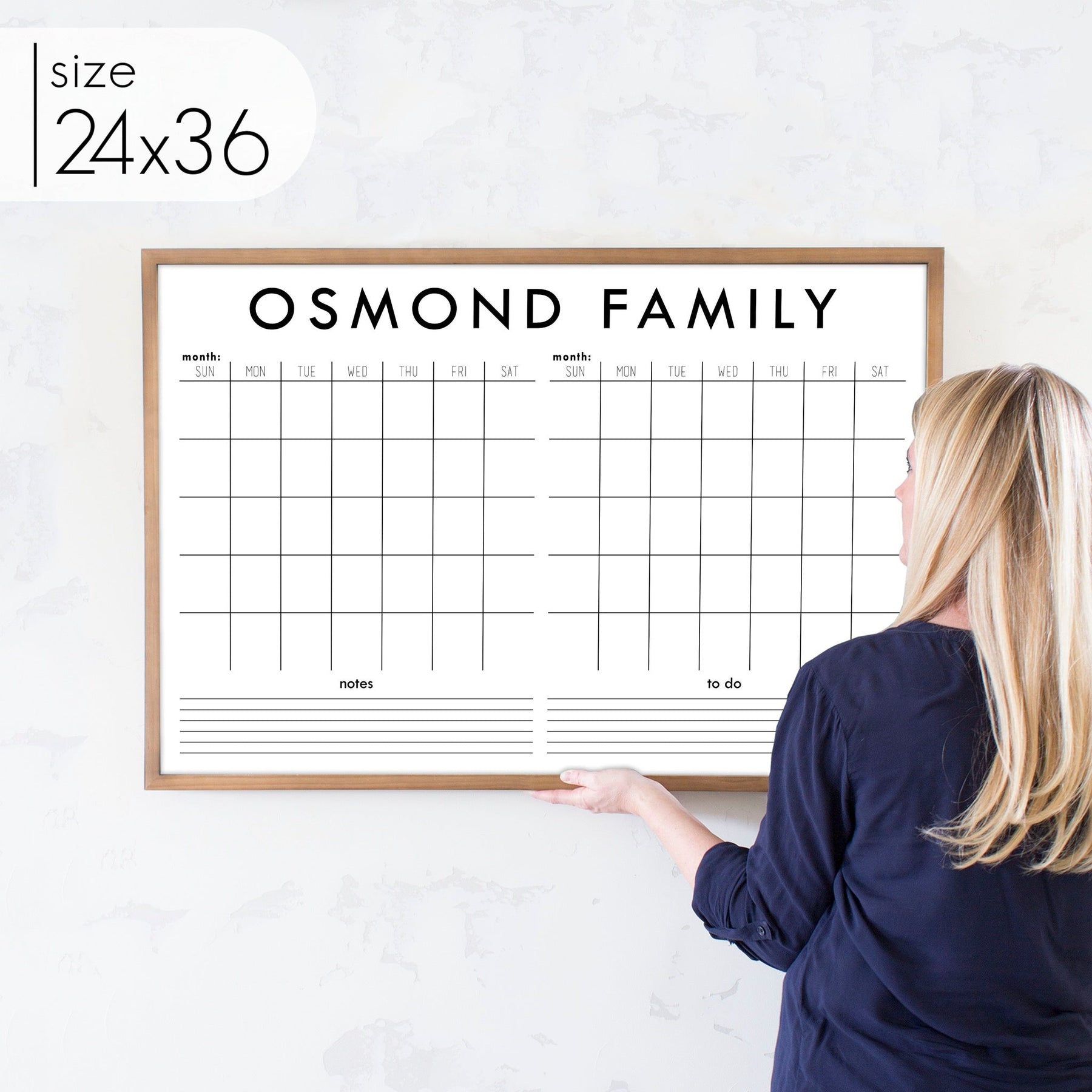 A framed whiteboard calendar with a two month design format hanging on the wall
