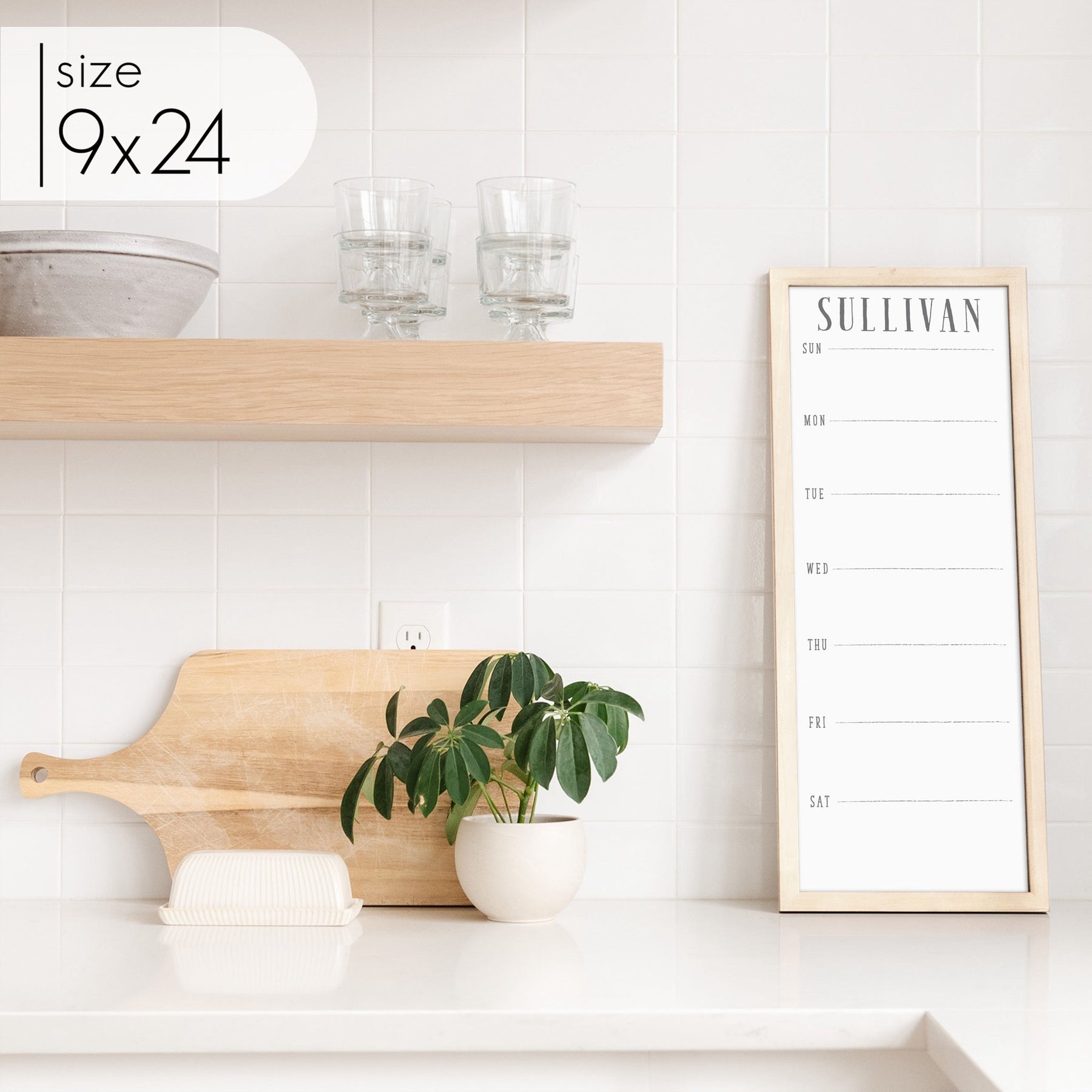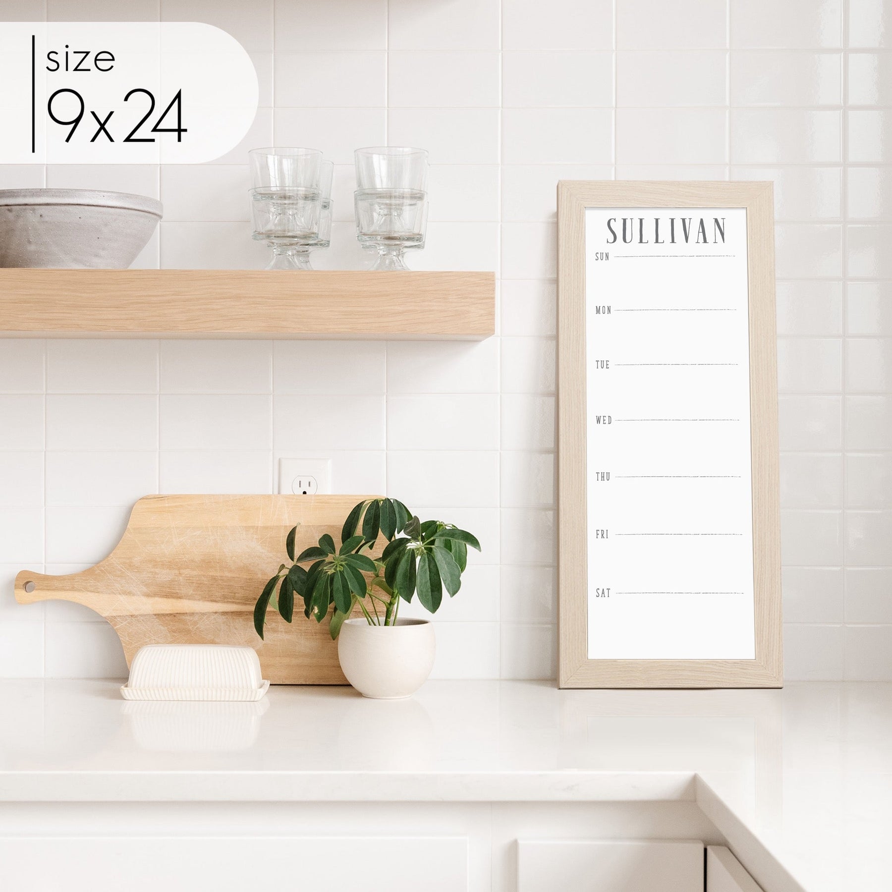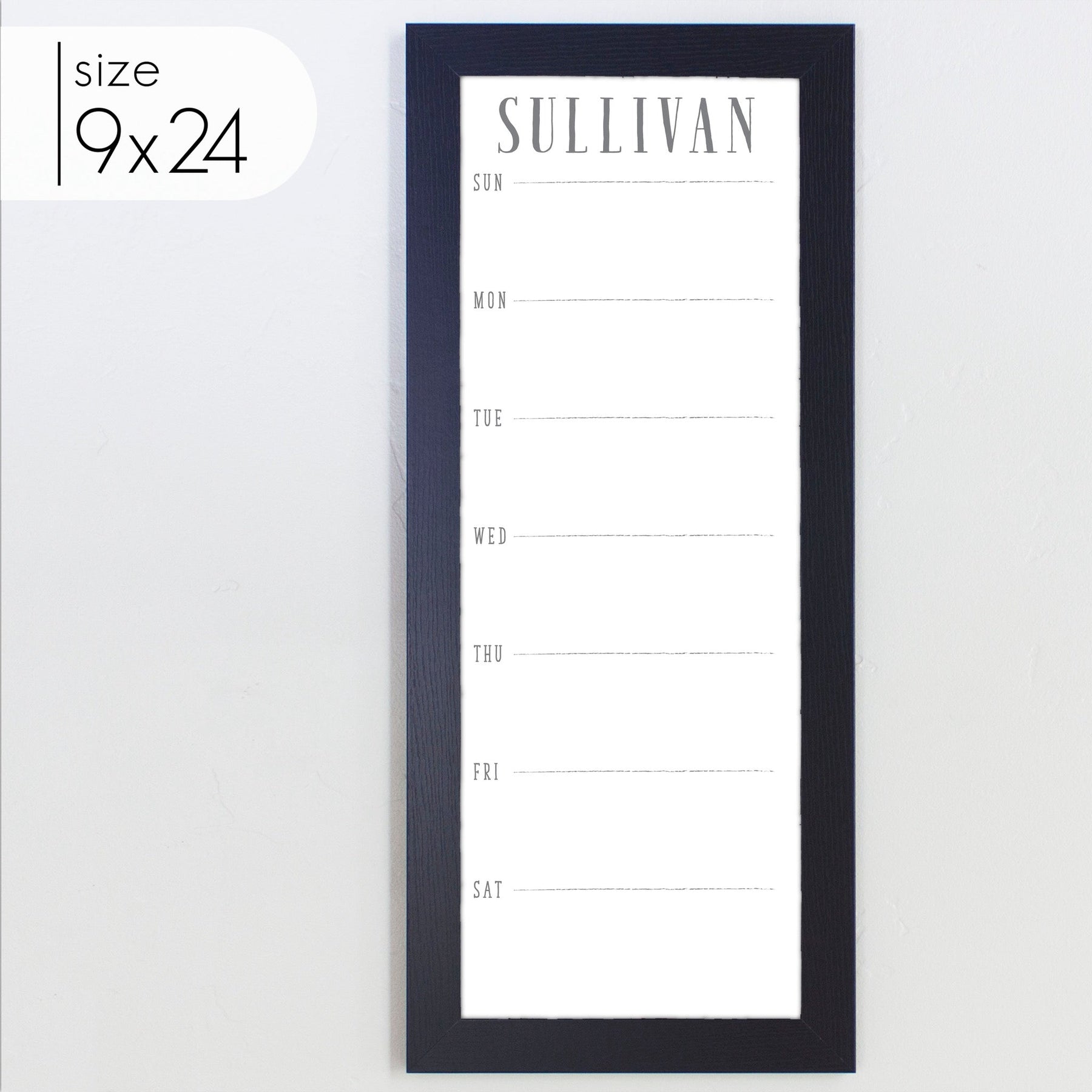 A framed slim whiteboard weekly calender hanging on the wall