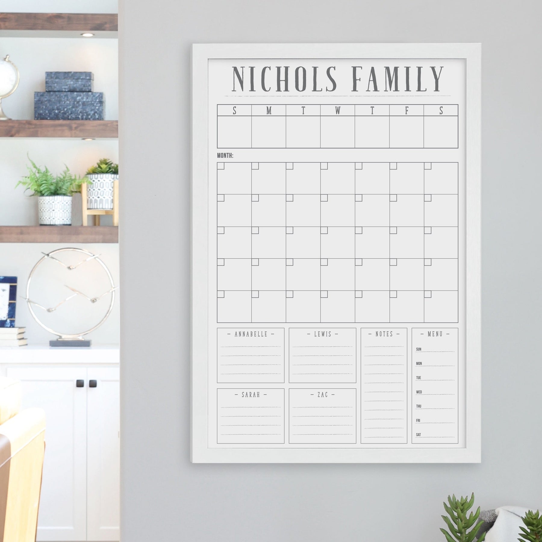 A framed whiteboard calendar with a monthly and weekly format hanging on the wall