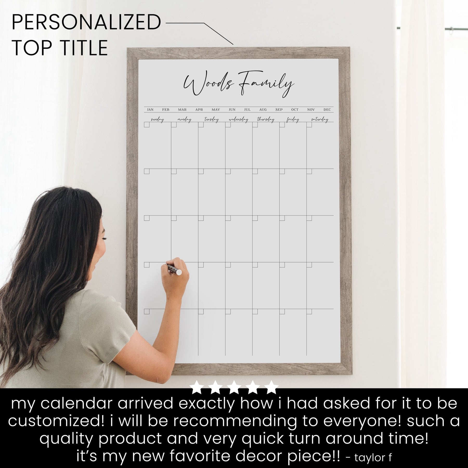Our best-selling and original design, this custom dry-erase calendar is the perfect way to keep your family on track every month. Our top-rated whiteboard calendar is not only functional but also adds a stylish, personal touch to your home. Unlike typical dry erase boards, this design enhances your space without being an eyesore.