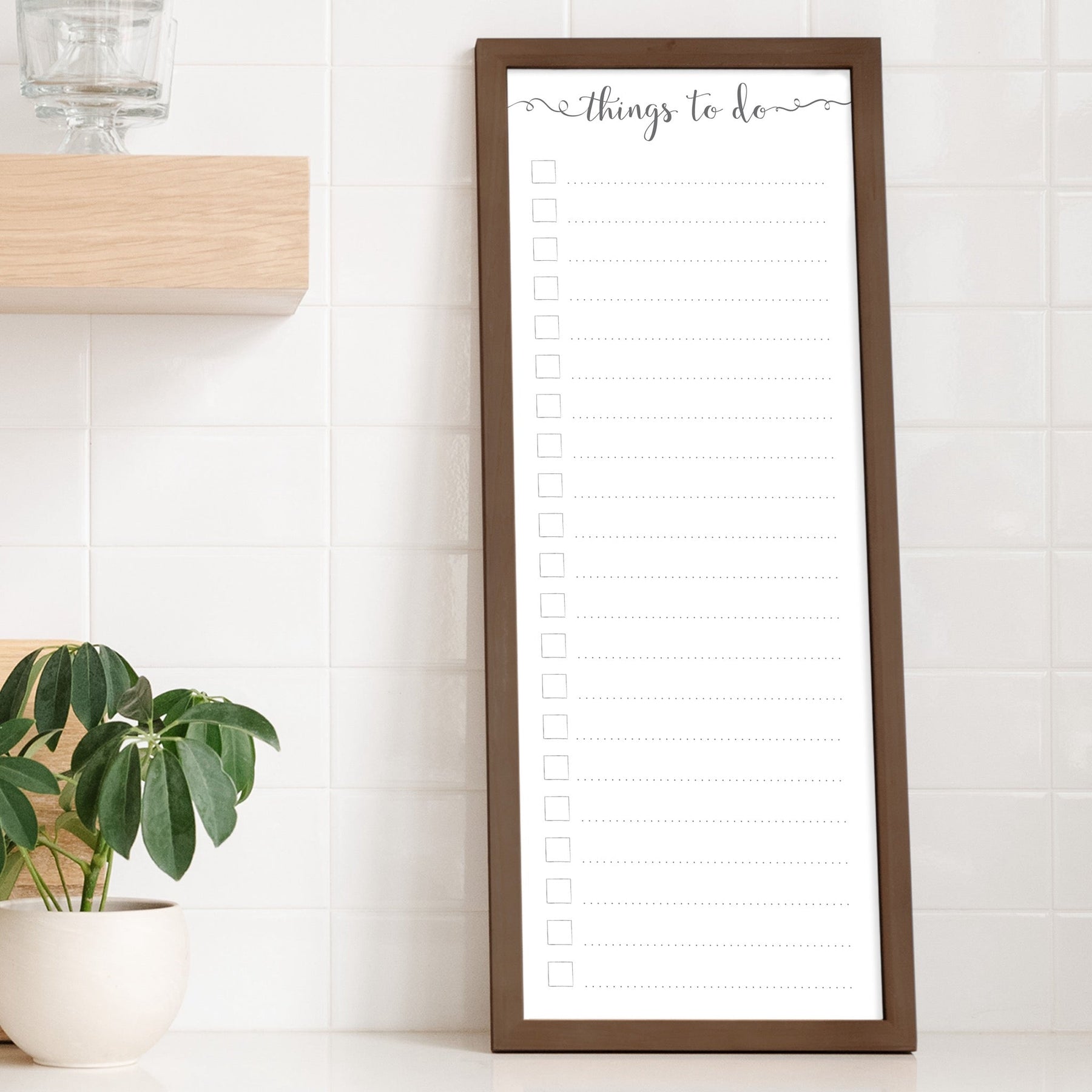 Keep your tasks organized with this slim framed whiteboard checklist! The perfect way to track your progress and achieve your goals, this slim whiteboard for wall use helps you check off your to-do list with ease. No more keeping mental tabs—free up your mind by jotting down important tasks on this functional and stylish checklist. Whether it’s daily reminders, errands, or big projects, this dry-erase board keeps you organized and focused, helping you stay on track and reach your goals. With its slim design, it fits perfectly in smaller spaces while still providing all the functionality you need.