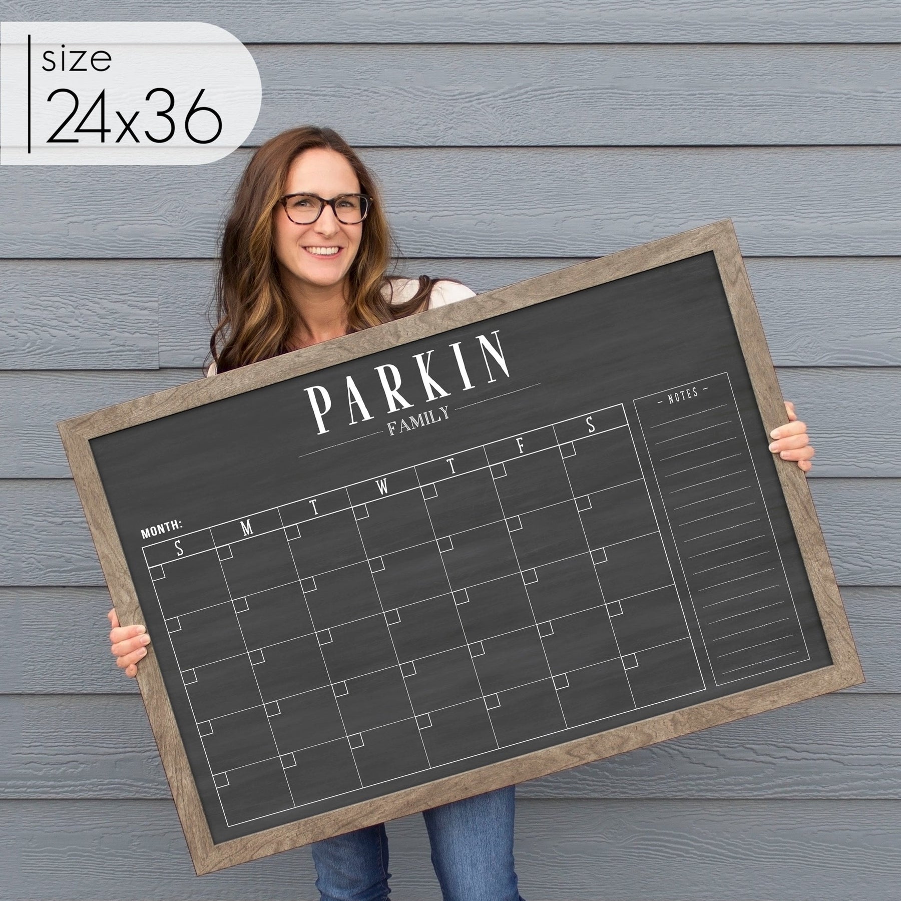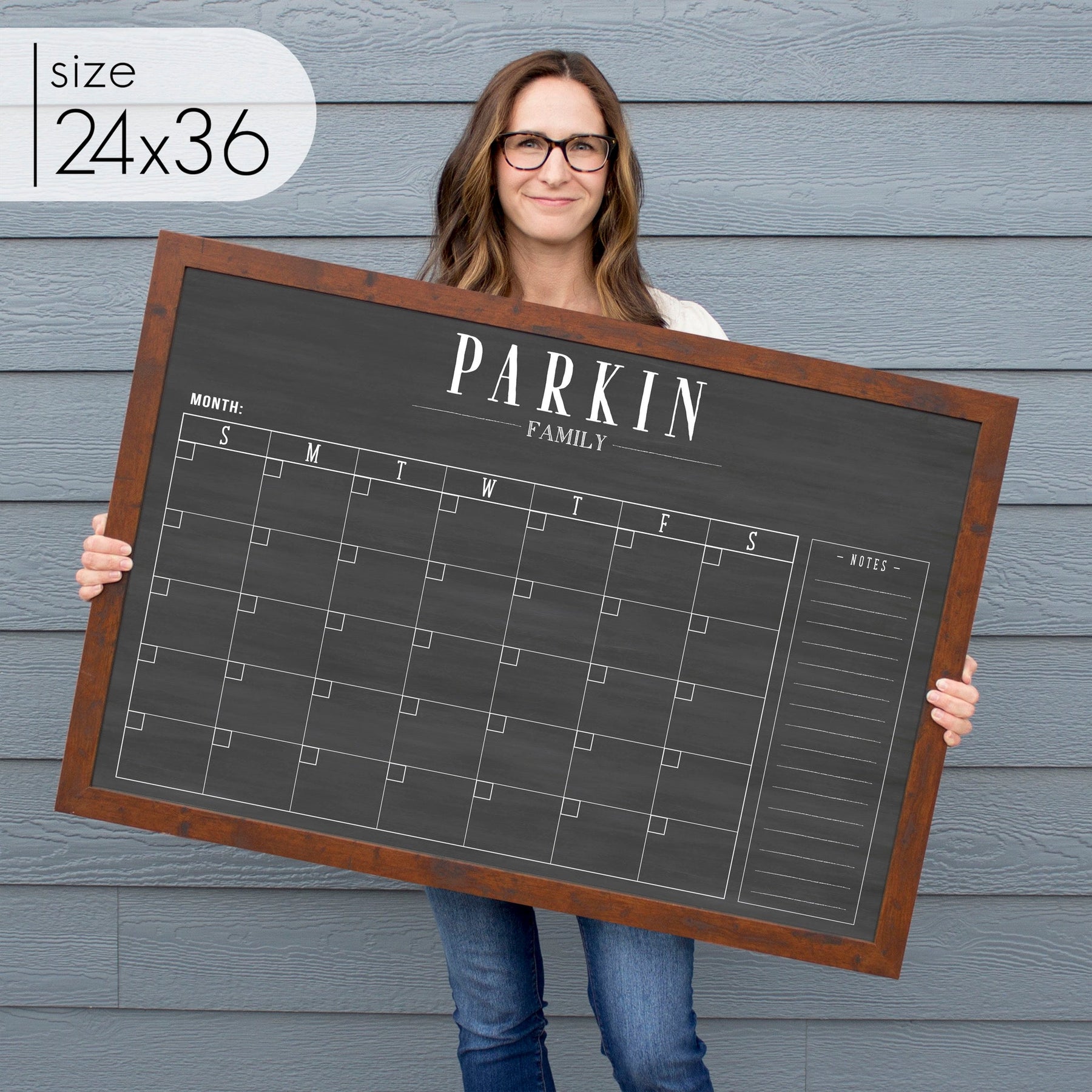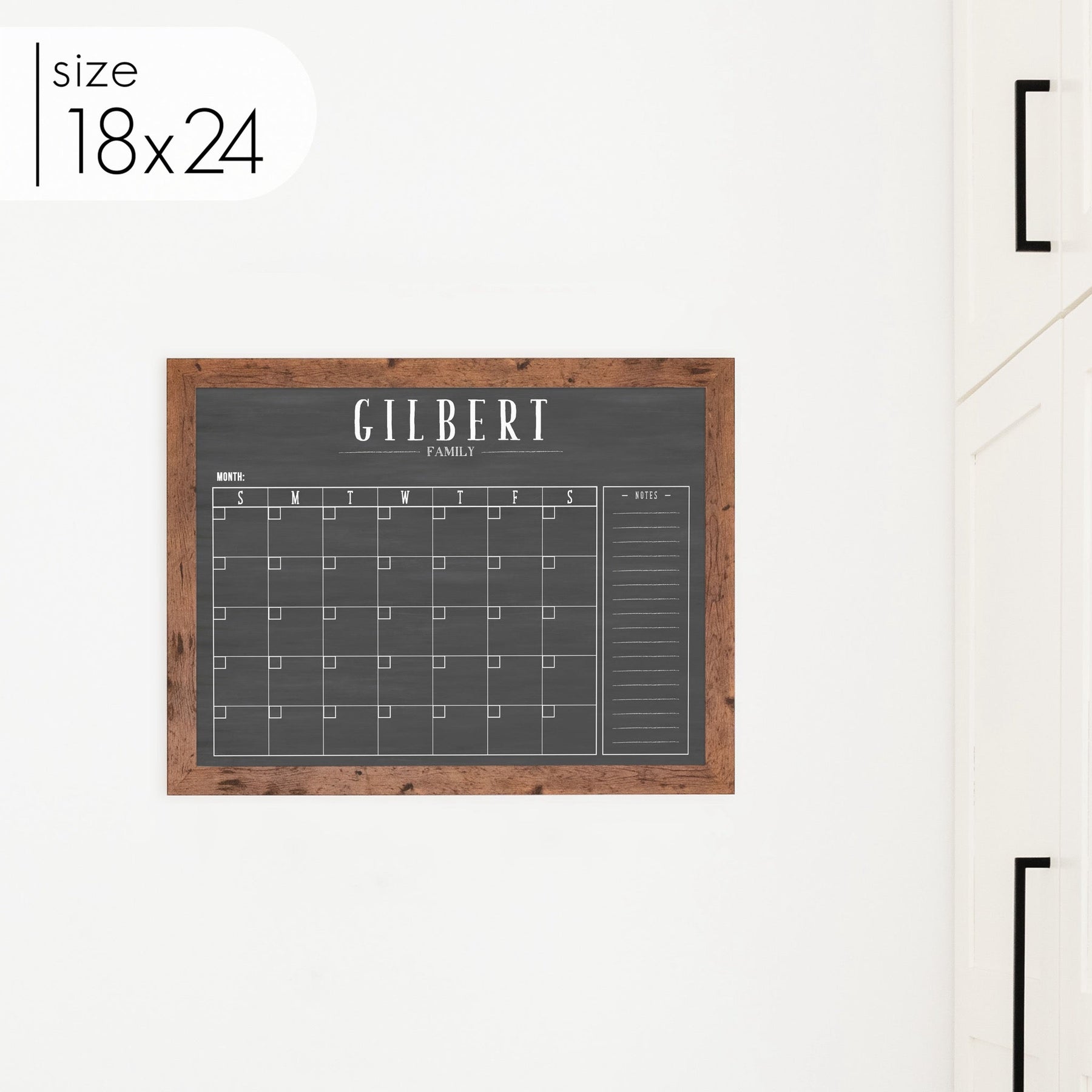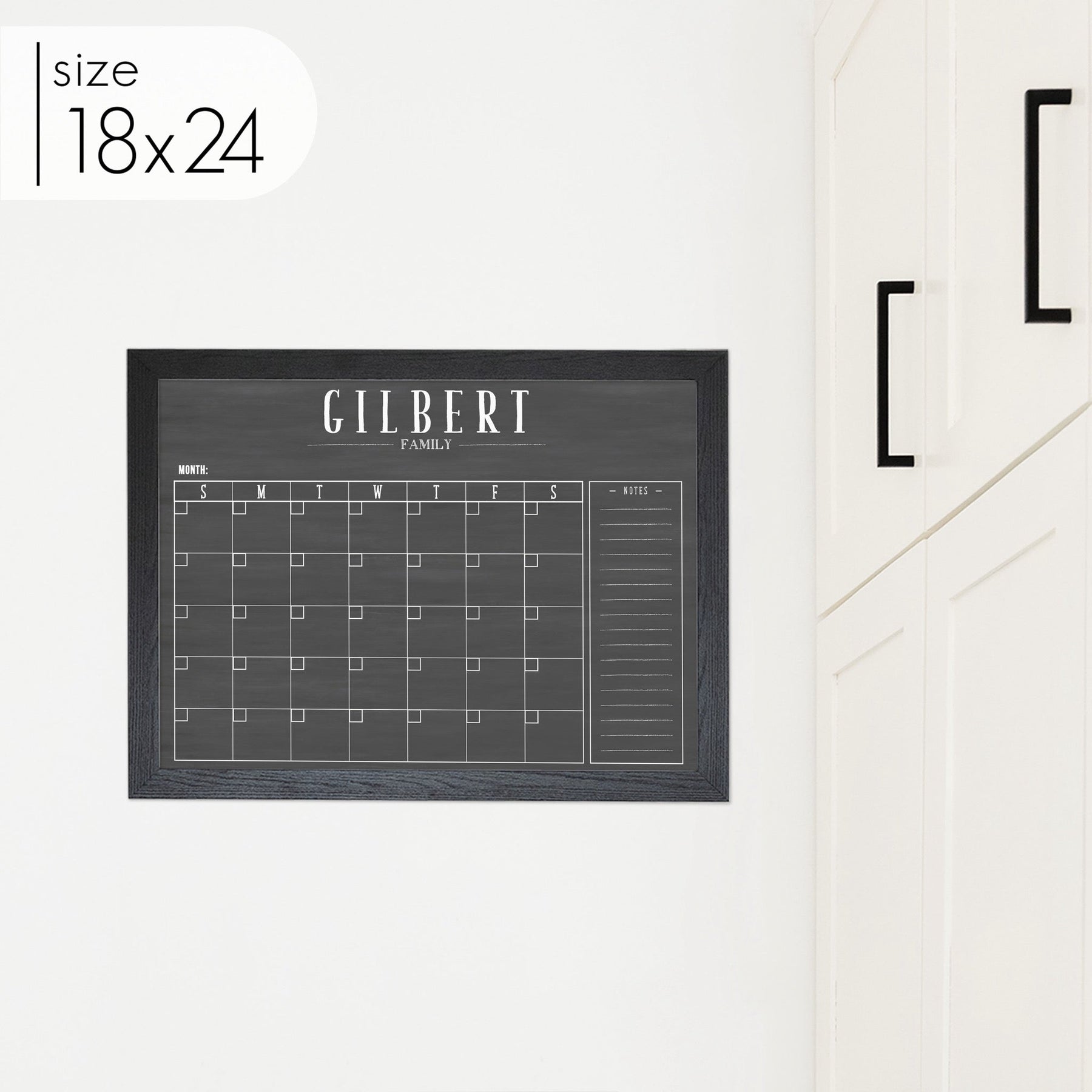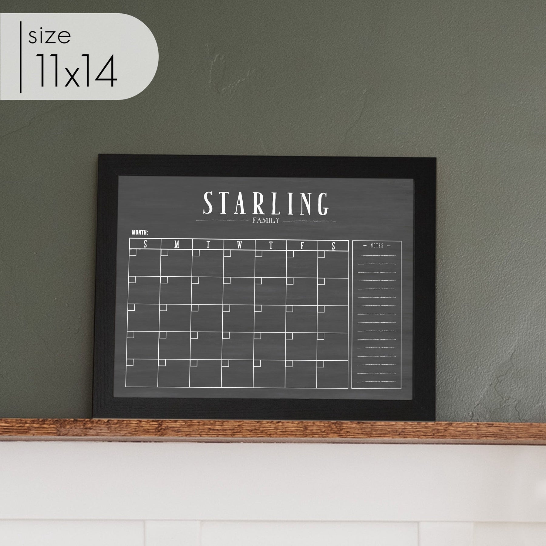 A framed dry-erase monthly calender with a chalkboard look hanging on the wall