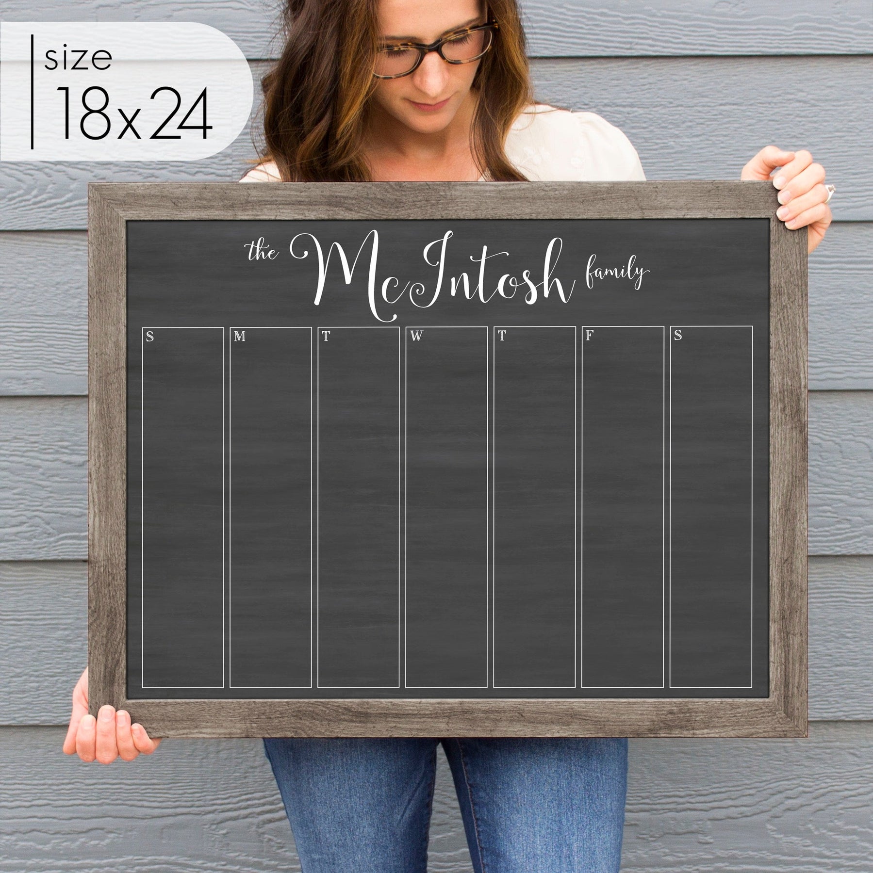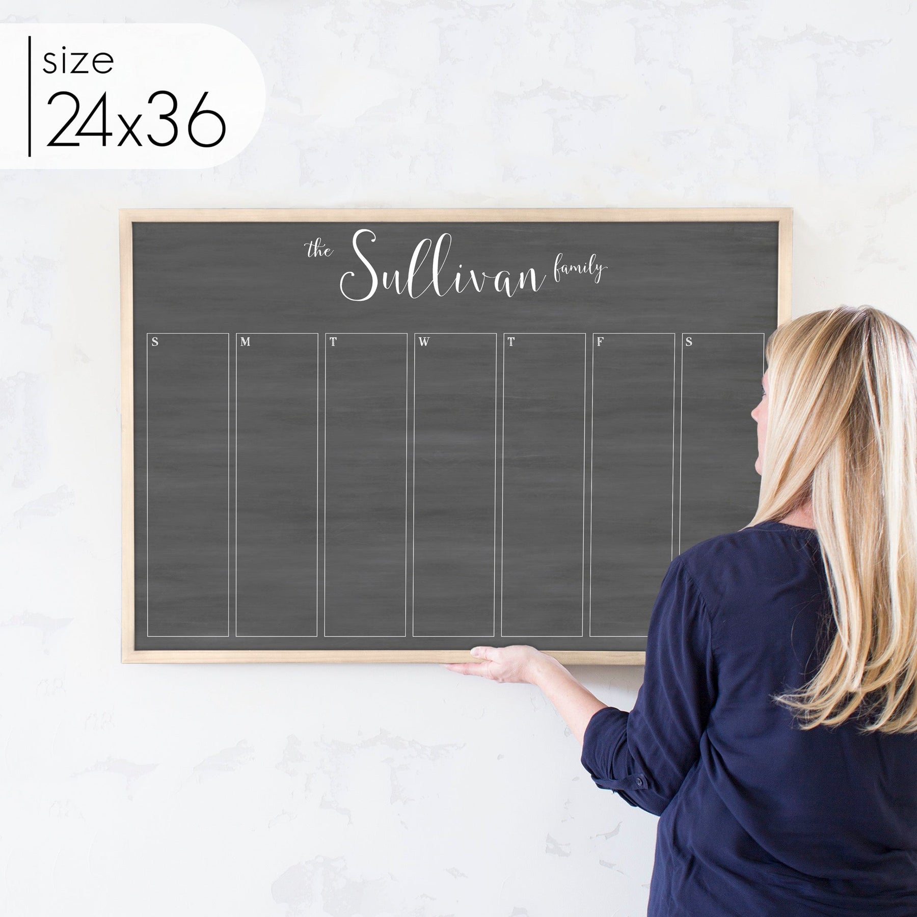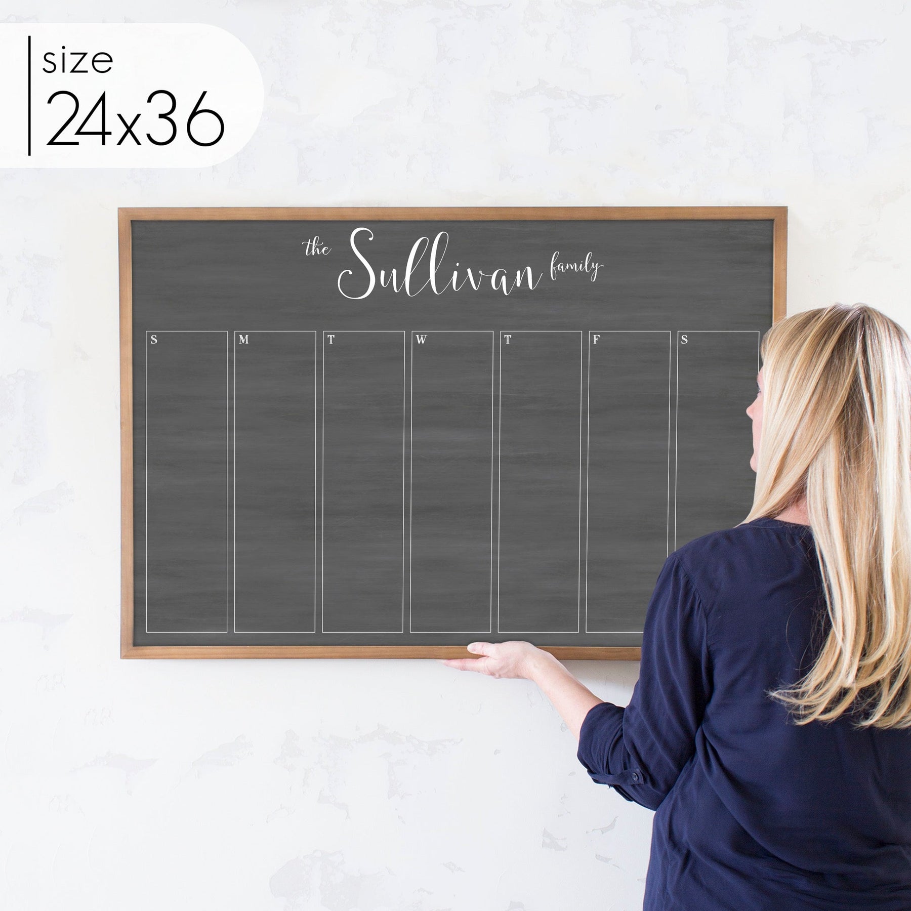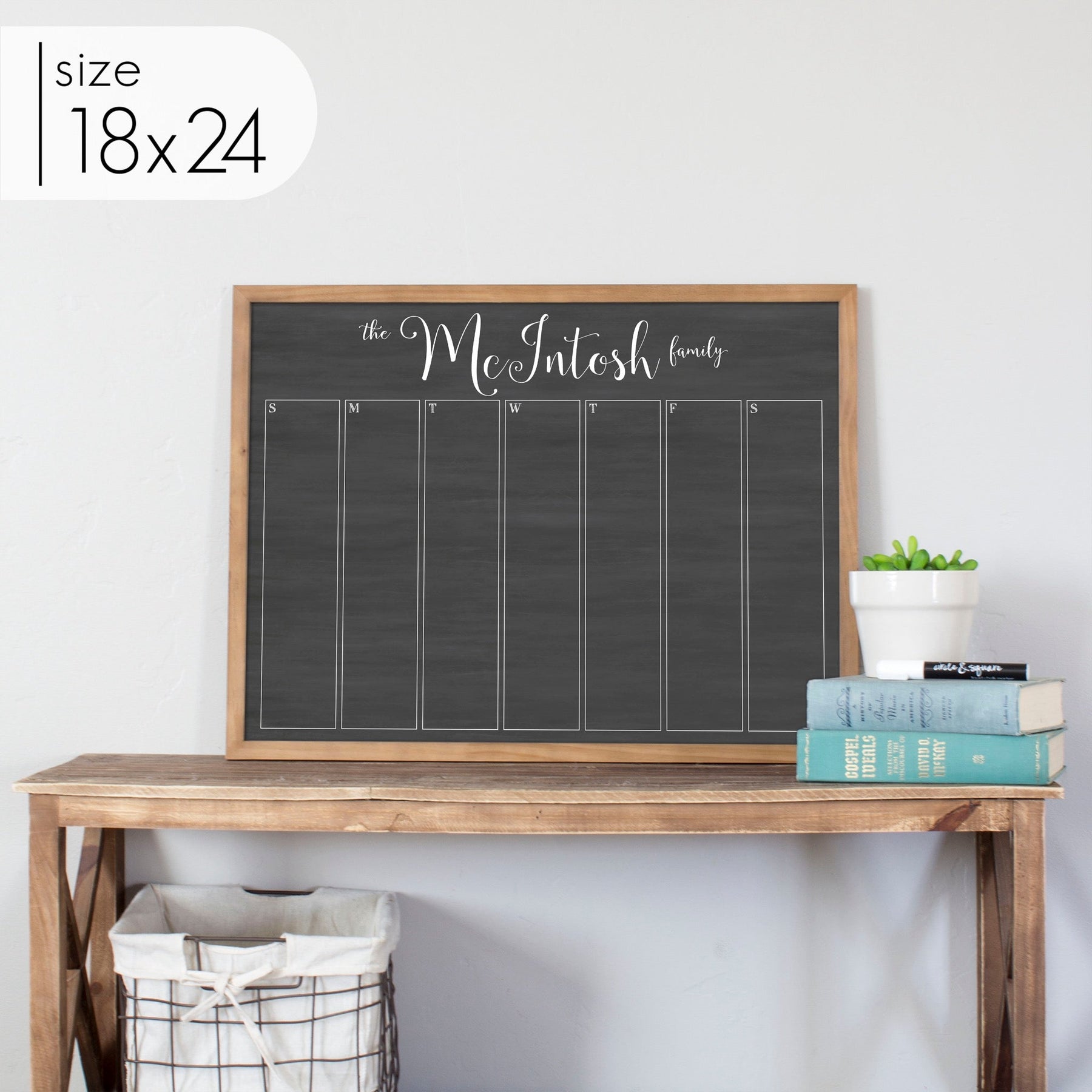 A framed dry-erase weekly calender with a chalkboard look hanging on the wall