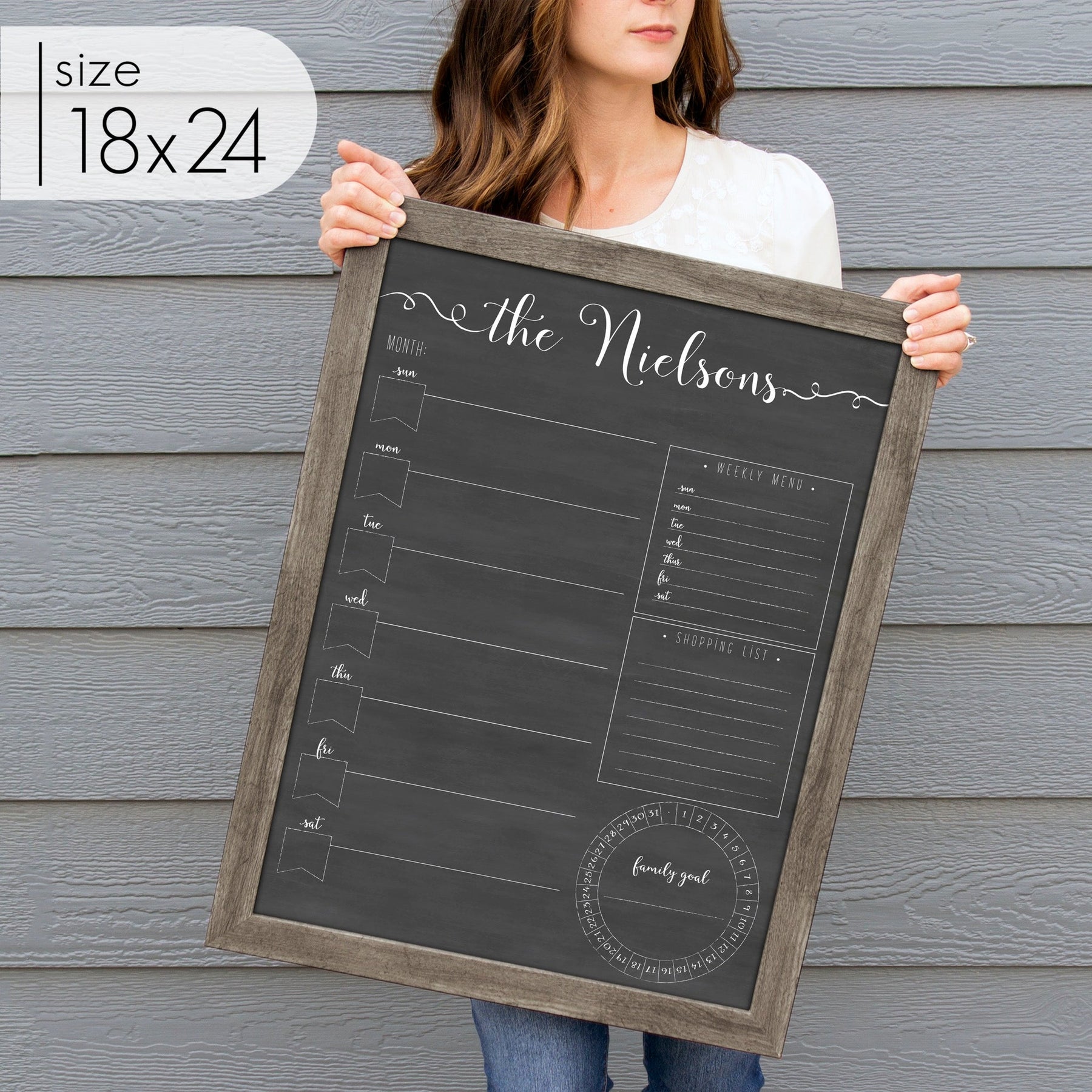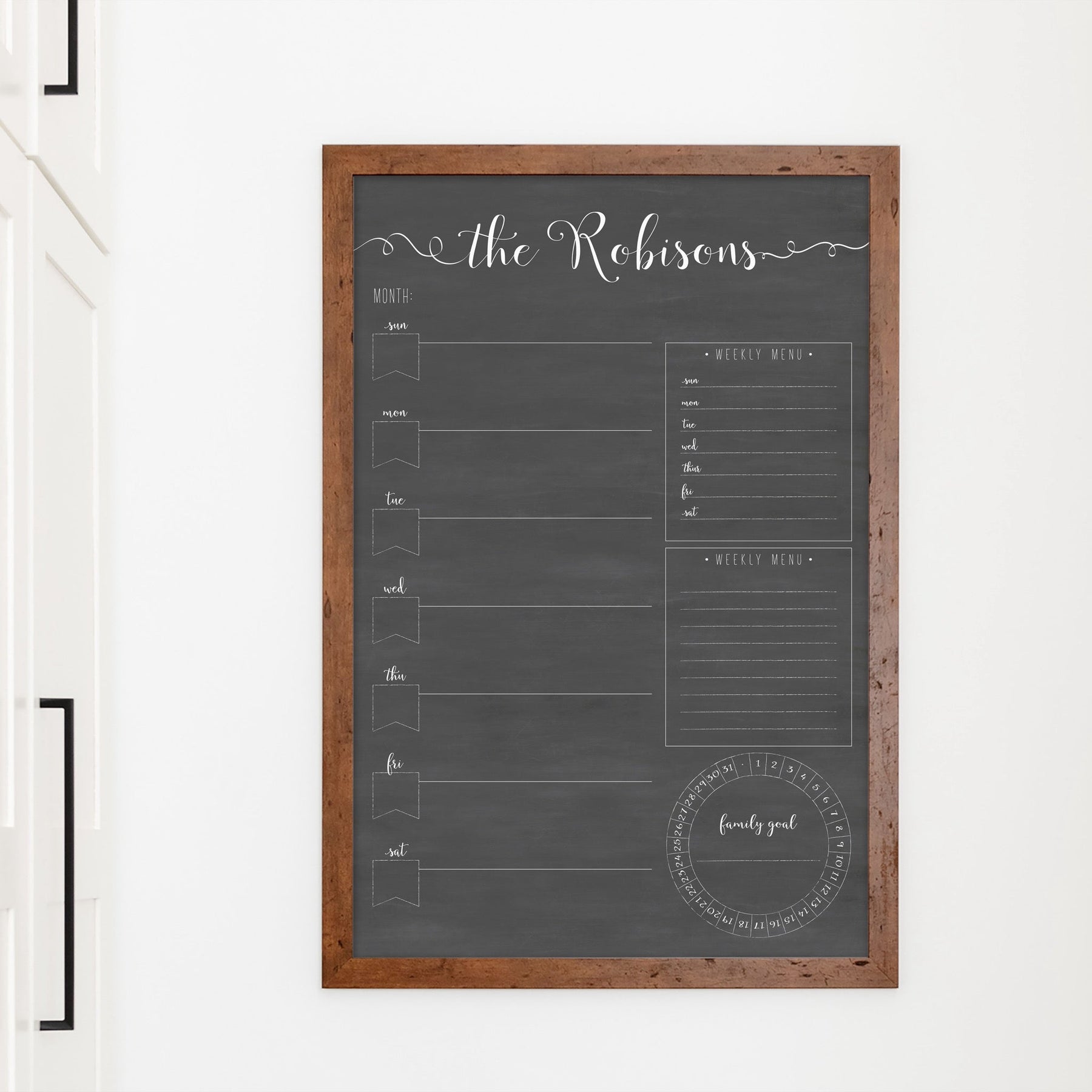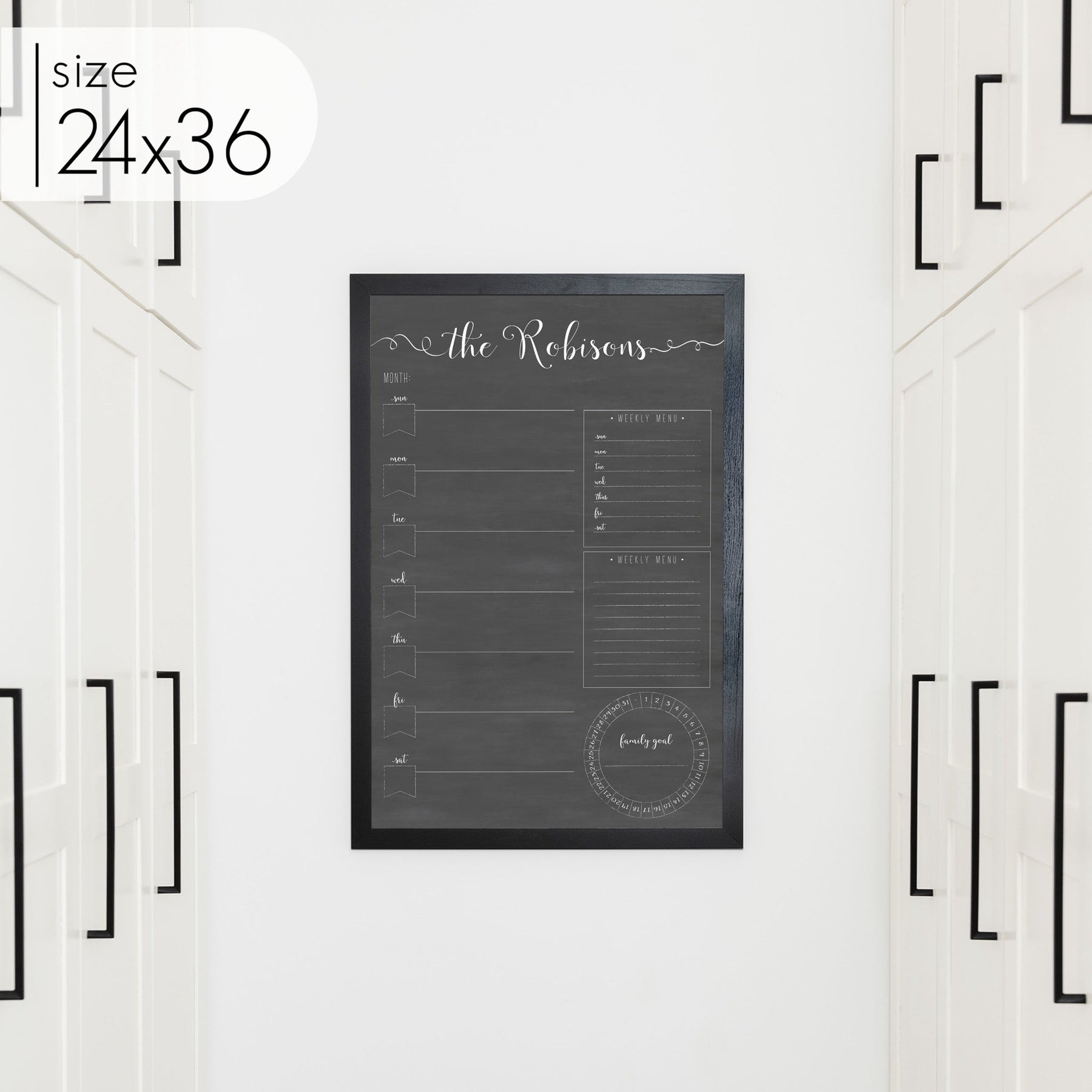 A framed dry-erase weekly calender with a chalkboard look hanging on the wall