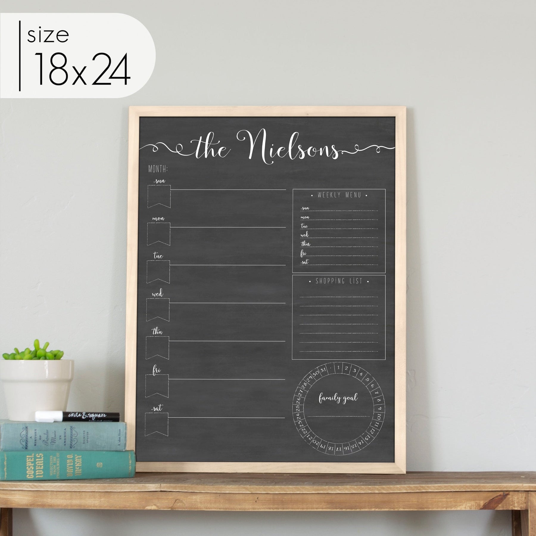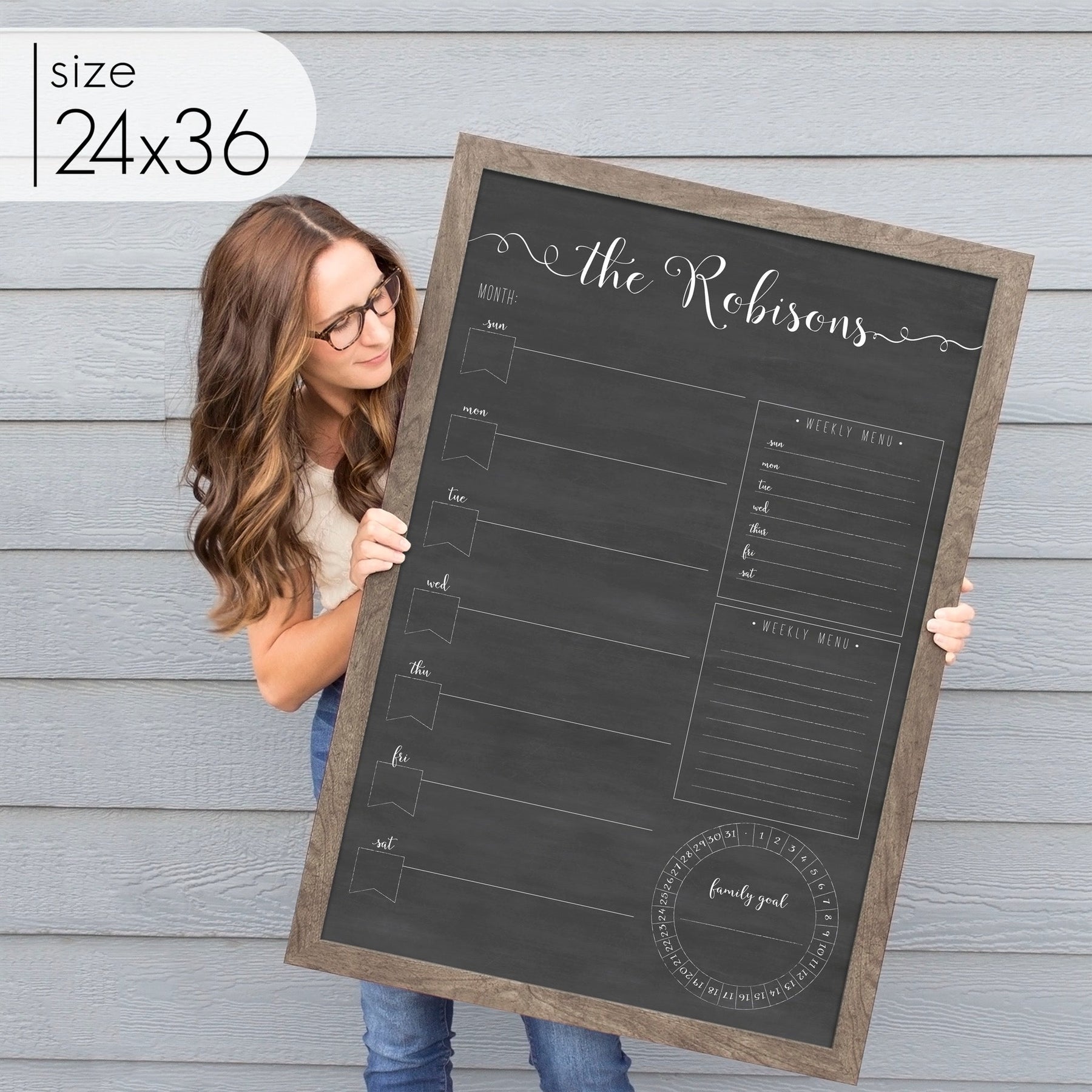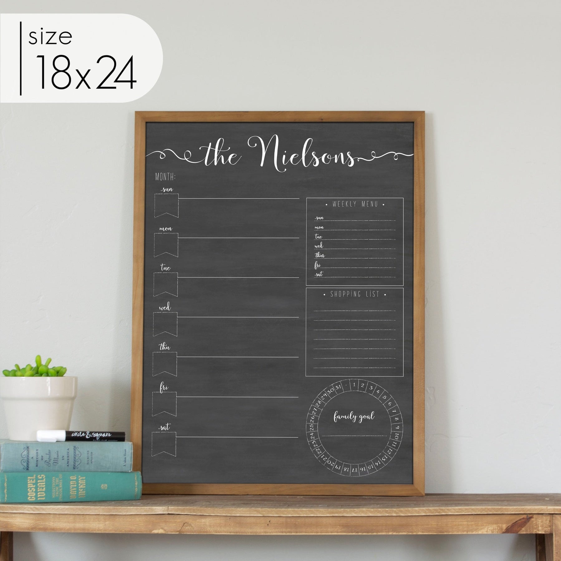 A framed dry-erase weekly calender with a chalkboard look hanging on the wall
