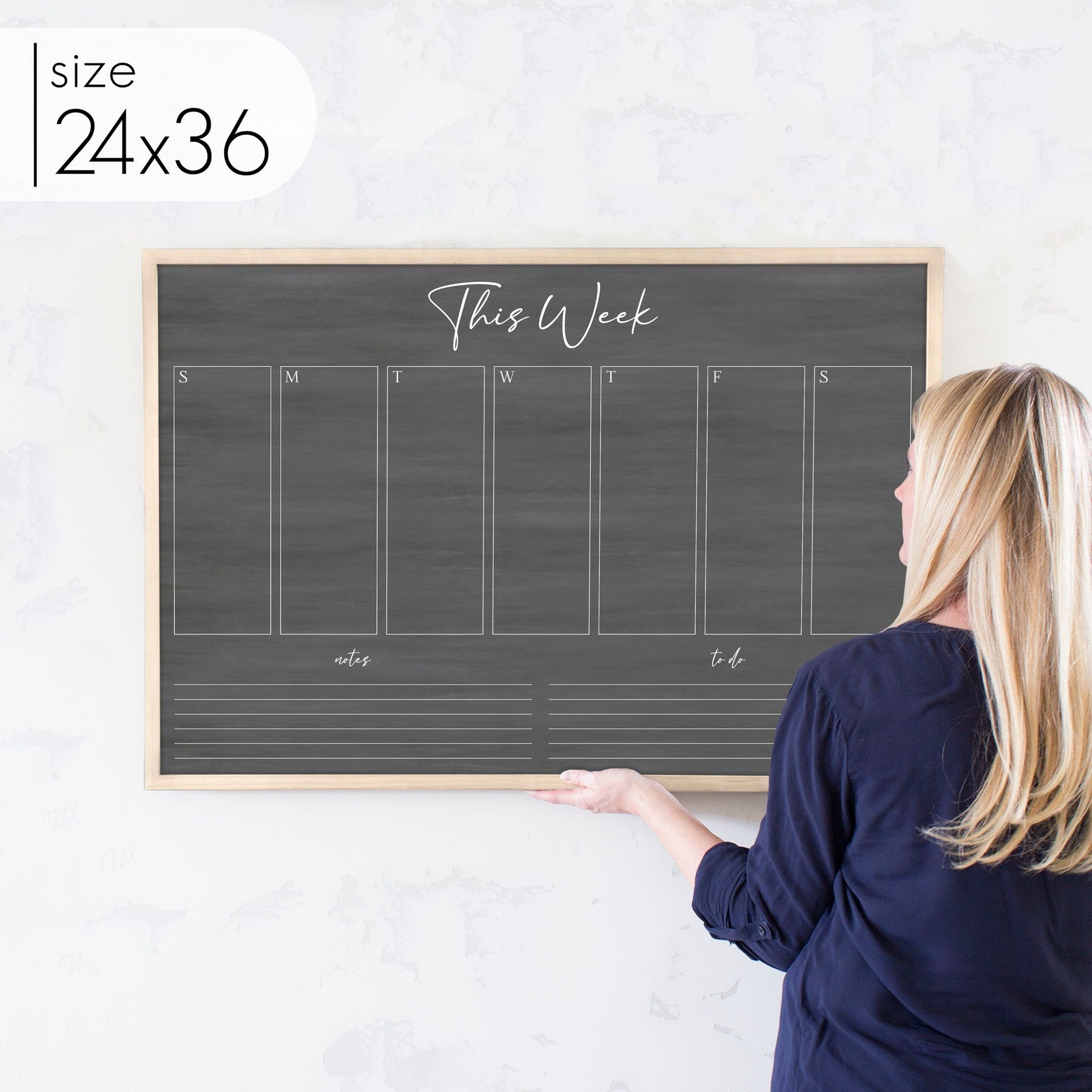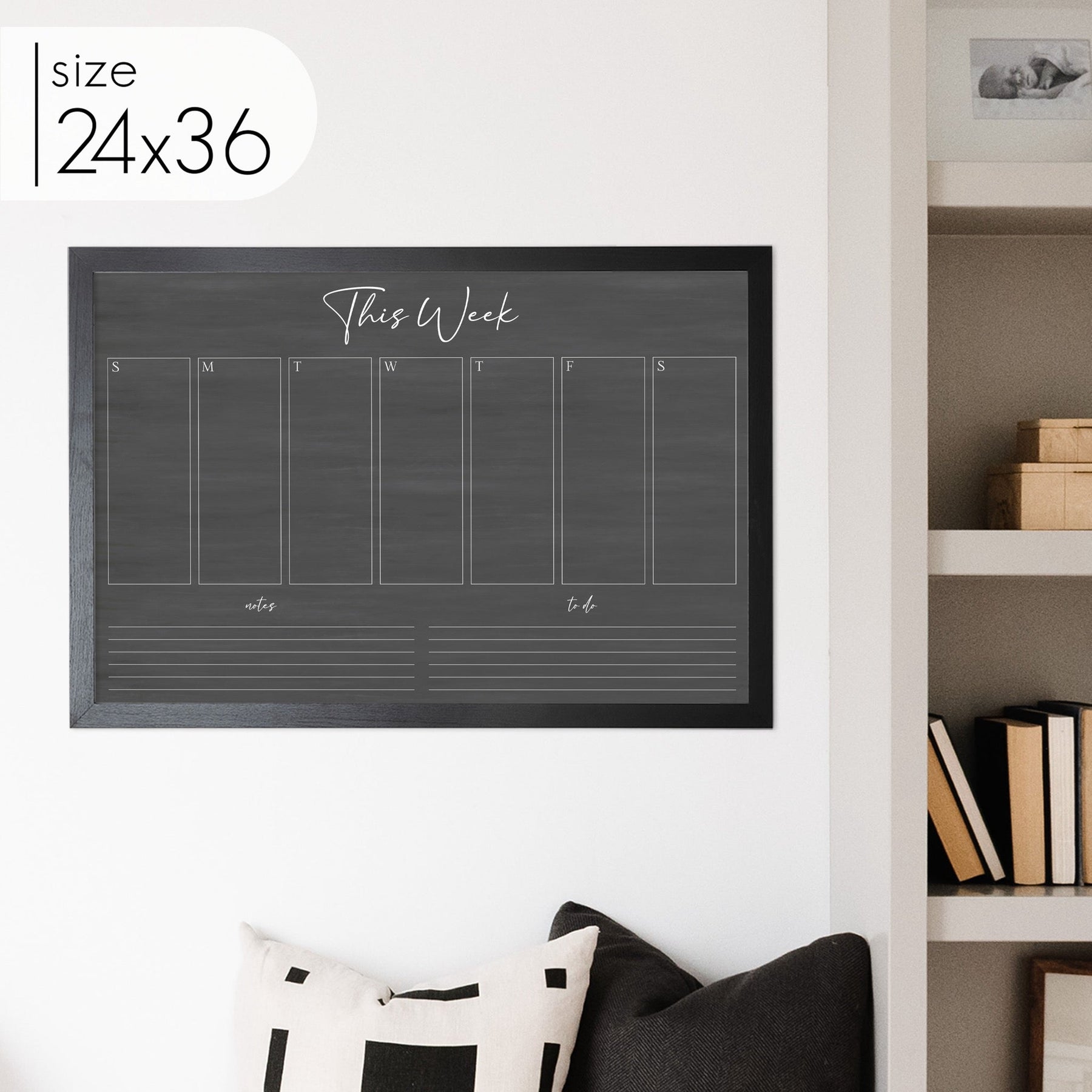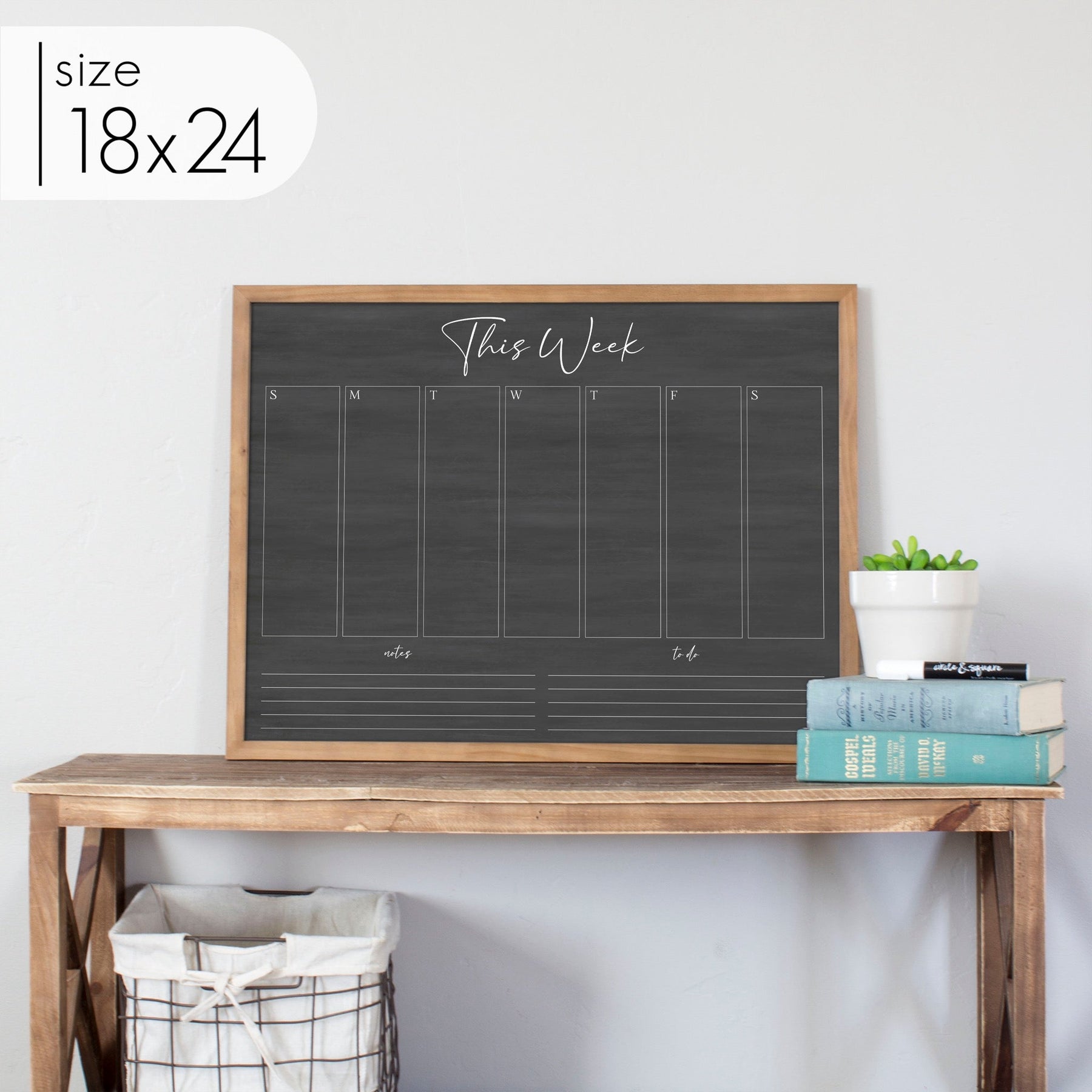 A framed dry-erase weekly calender with a chalkboard look hanging on the wall