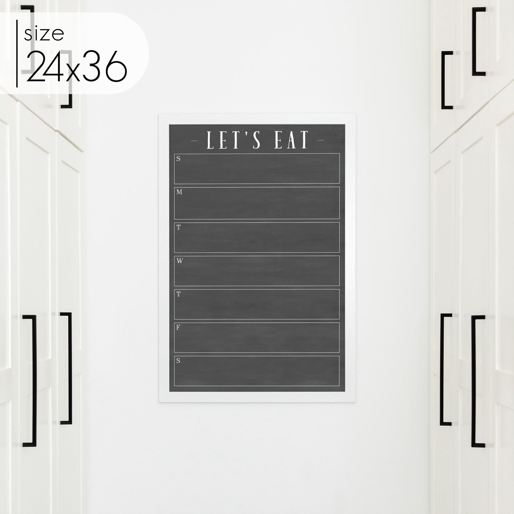 A framed dry-erase weekly calender with a chalkboard look hanging on the wall