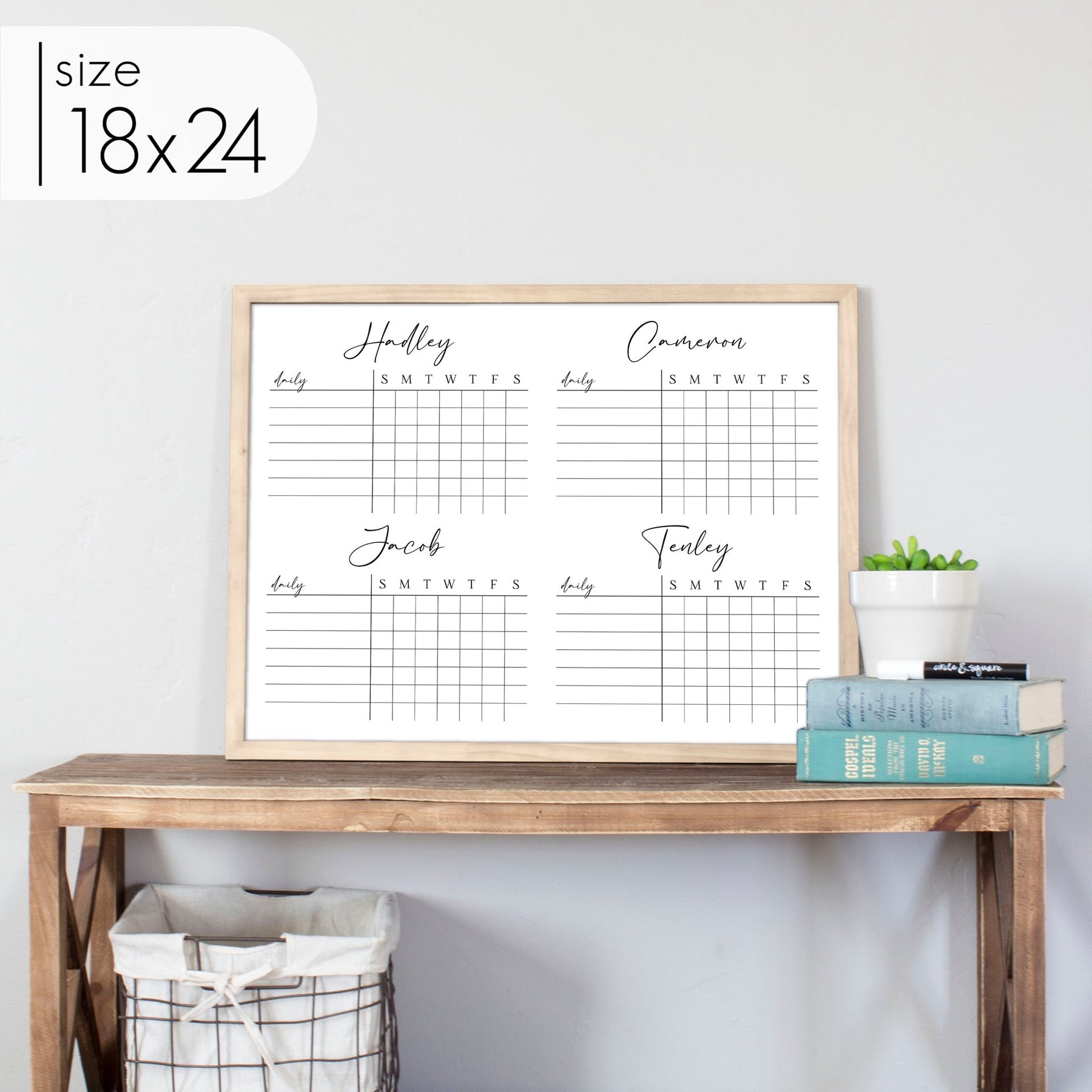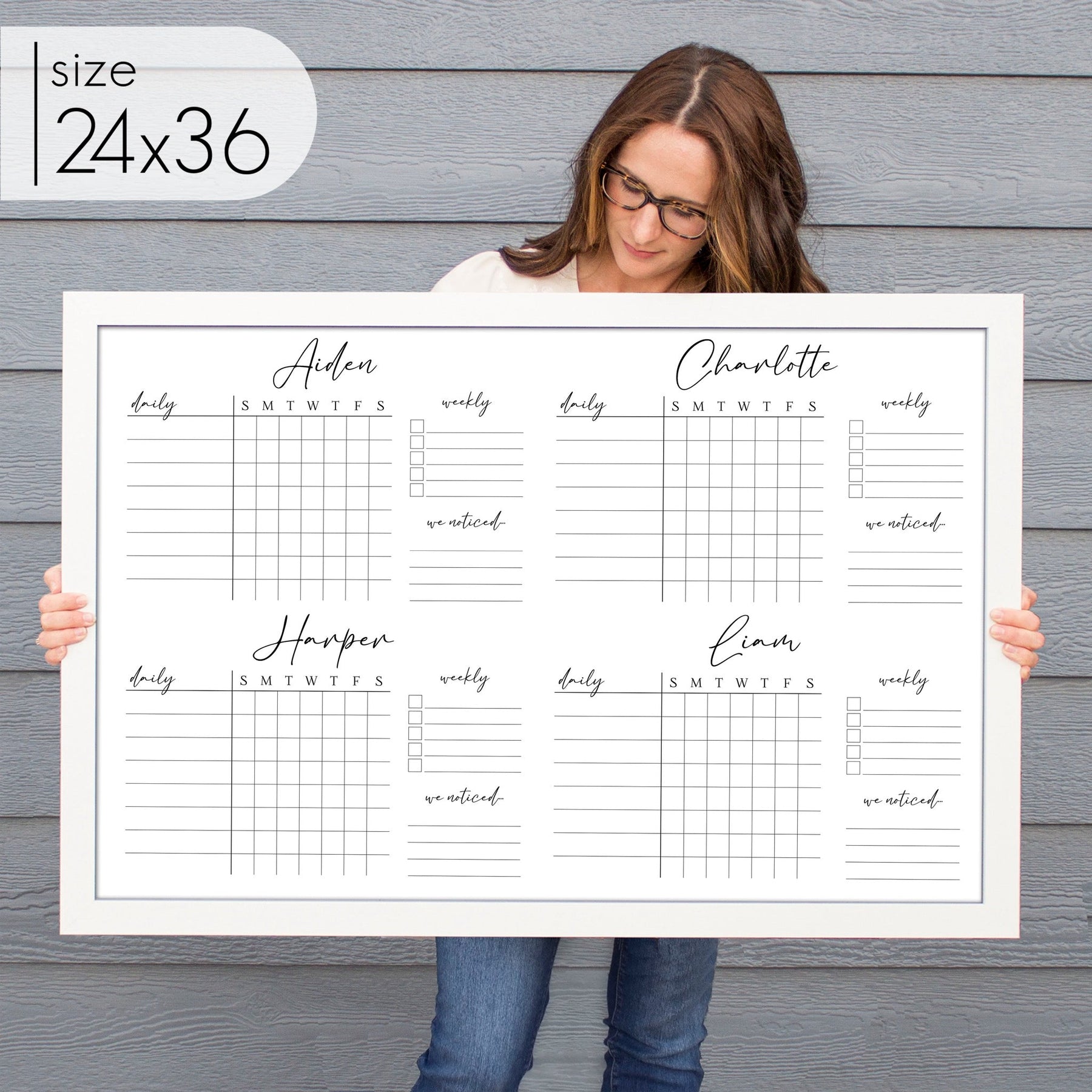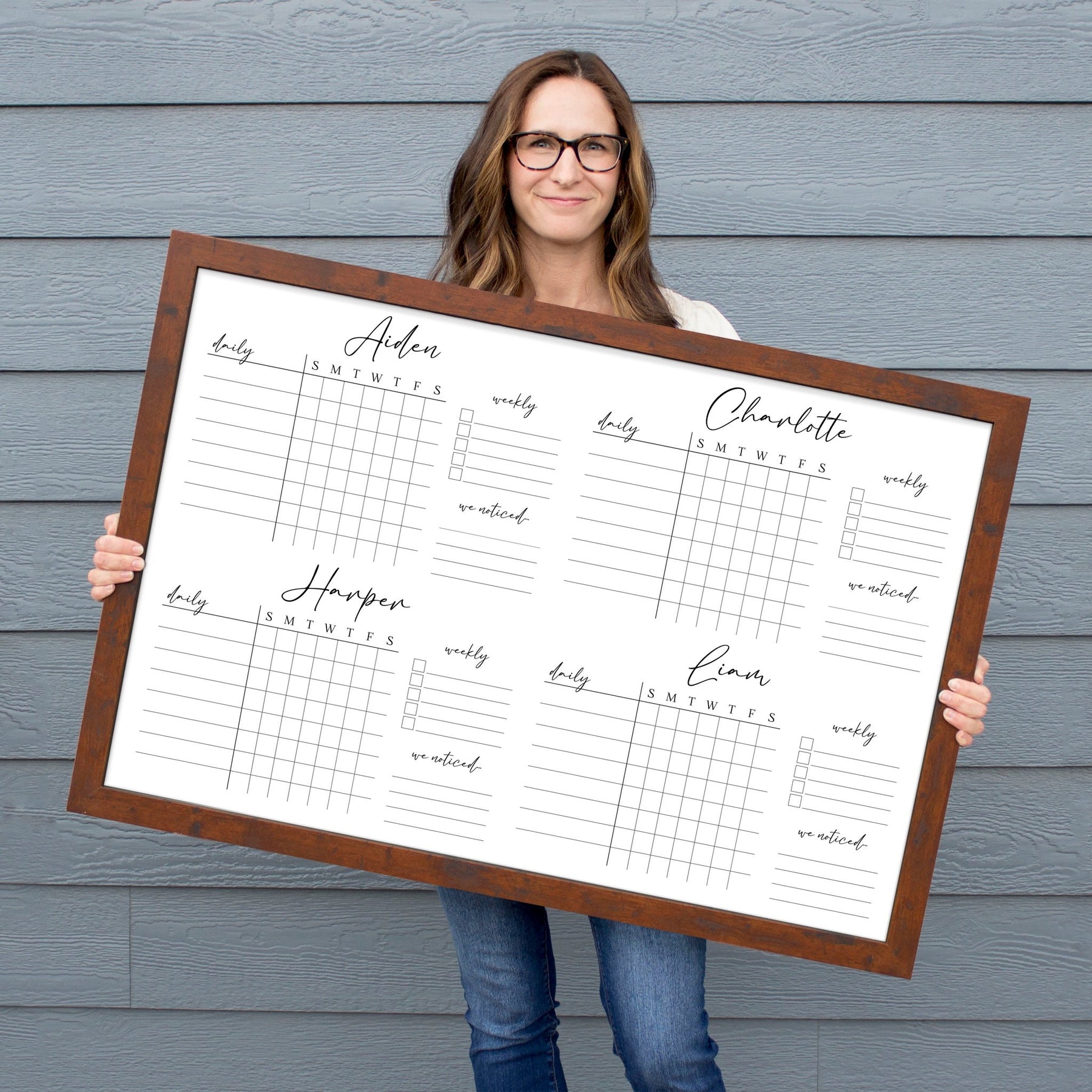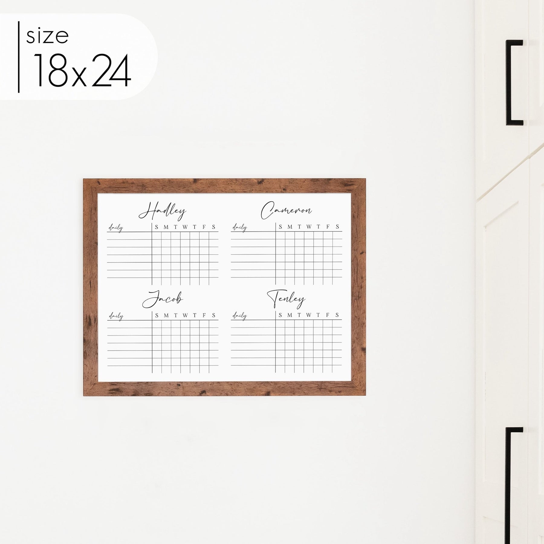 Help your kids stay on top of their responsibilities with our framed whiteboard kids chore chart! This fun and functional chart is designed to make organizing chores easy and interactive for your little ones. Featuring a dry-erase surface, it allows you to easily write and update tasks for each day or week, so your children can track their progress and check off completed chores.