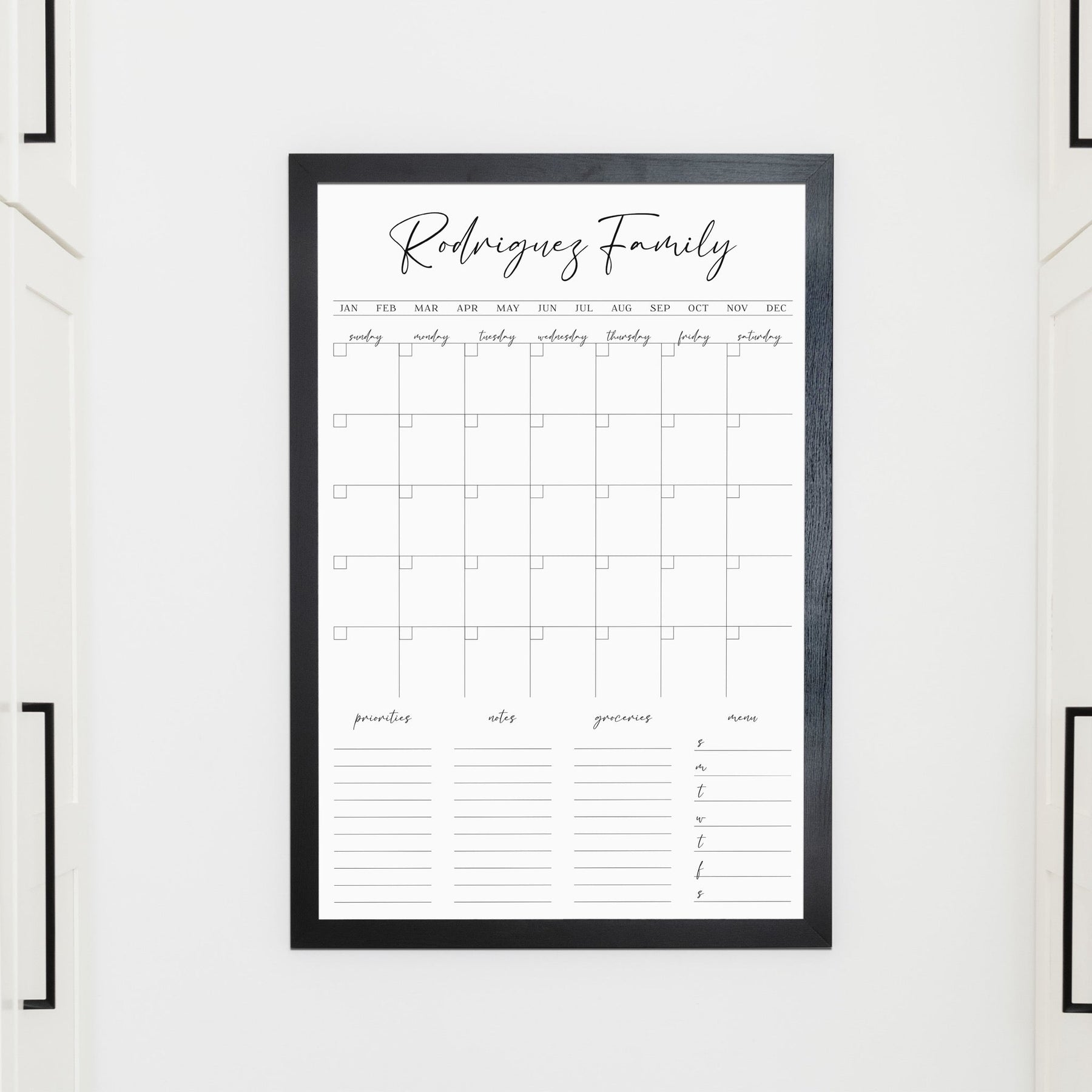 A framed whiteboard family command center hanging on the wall