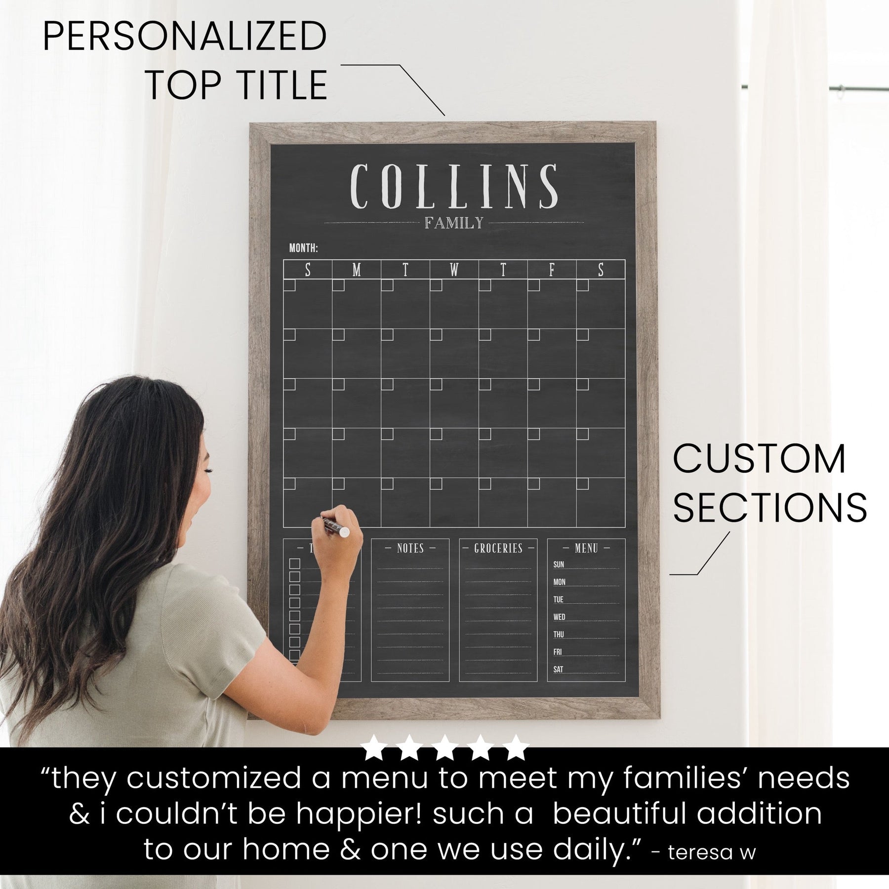 This custom large dry erase board is the ultimate command center for your wall! Featuring a monthly calendar and multiple customizable sections, you can tailor it to your family's specific needs, whether that’s menu planning, grocery shopping, chores, to-dos, and more. The non-glare surface ensures your writing is clear and easy to read, making it perfect for busy households. The best part about this chalkboard calendar is that it's not only practical but also adds to your home decor. It’s the perfect command center for staying organized while bringing style and function to your space!