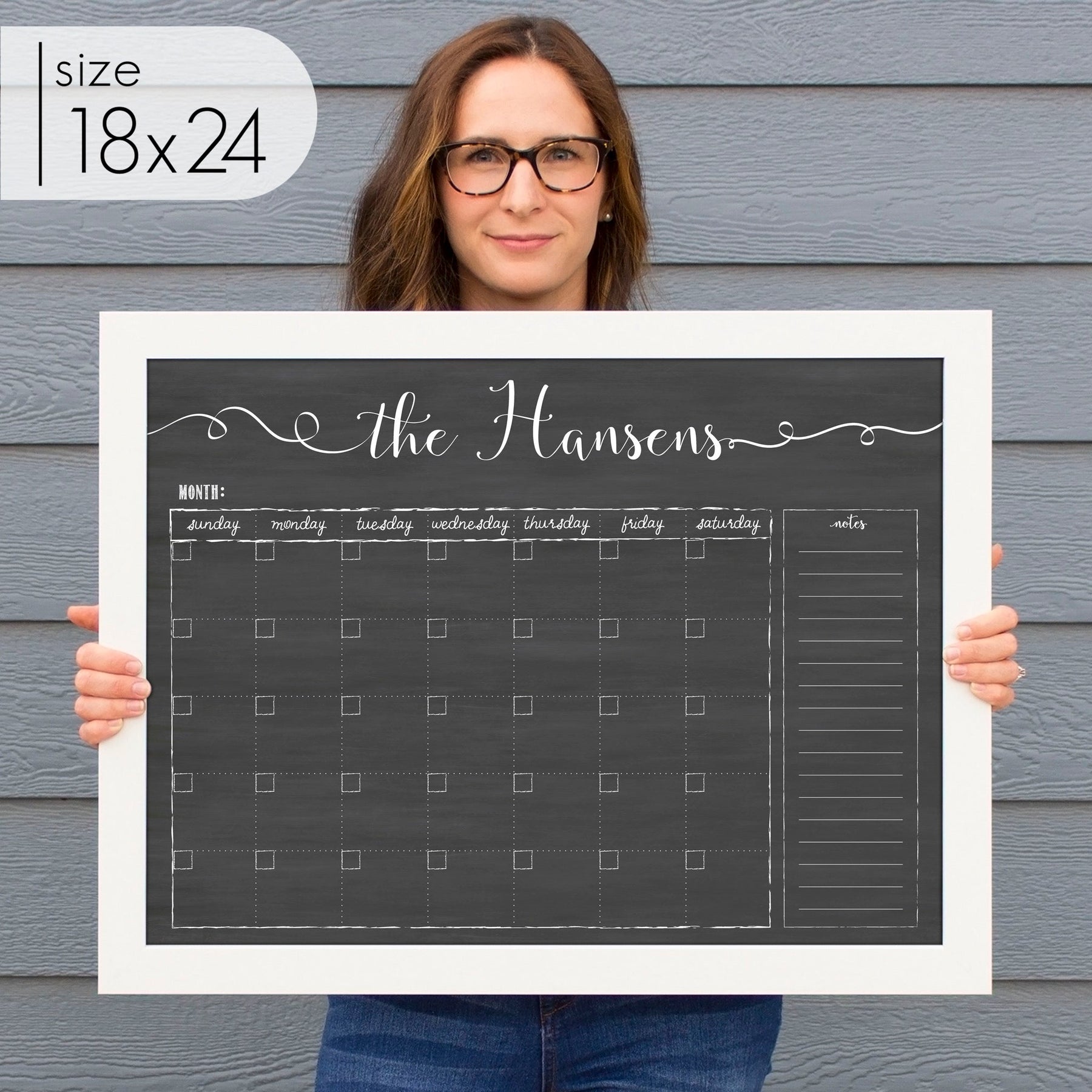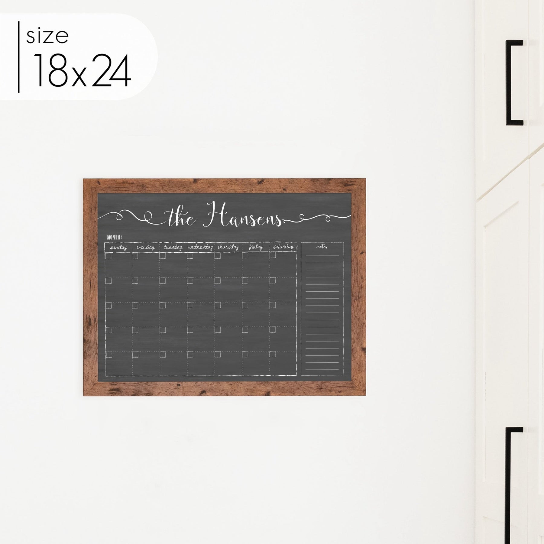 A framed dry-erase monthly calender with a chalkboard look hanging on the wall