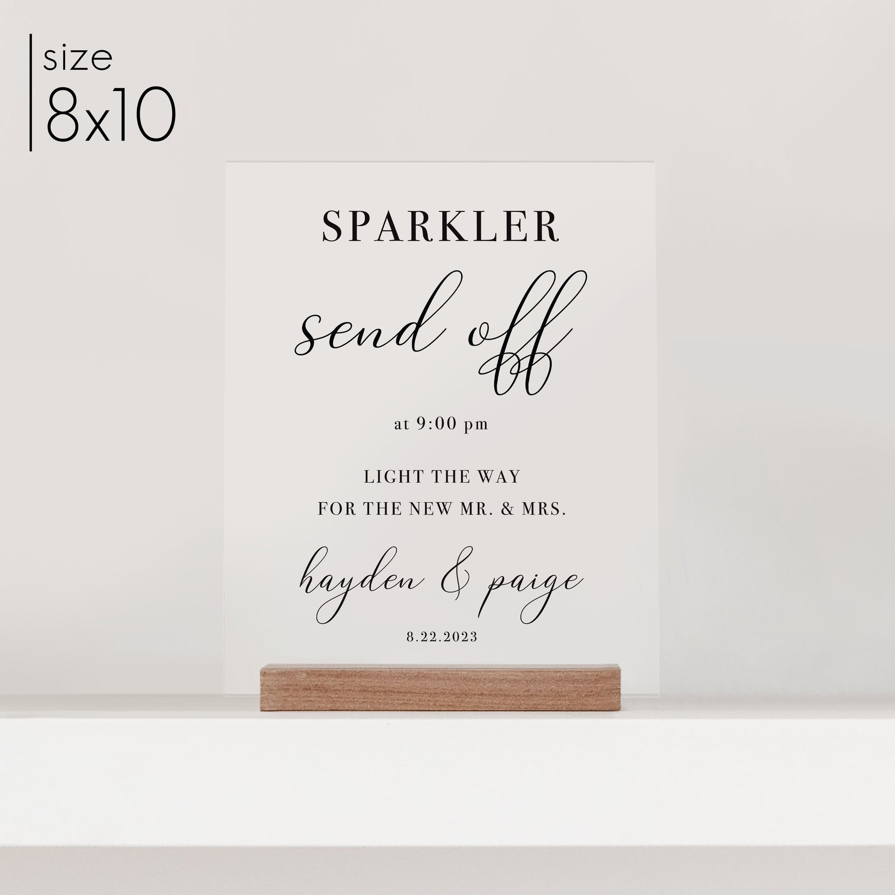 Add a touch of magic to your wedding send-off with our personalized sparkler send-off sign. Customize it with the time of your send-off, as well as your names and wedding date. Printed on high-quality clear acrylic, this sign comes with a convenient wood stand, making it effortless to display. Let your wedding guests know when and how to participate in this enchanting moment. It's a beautiful and practical way to communicate the details of your send-off, creating a memorable and coordinated experience for all.
