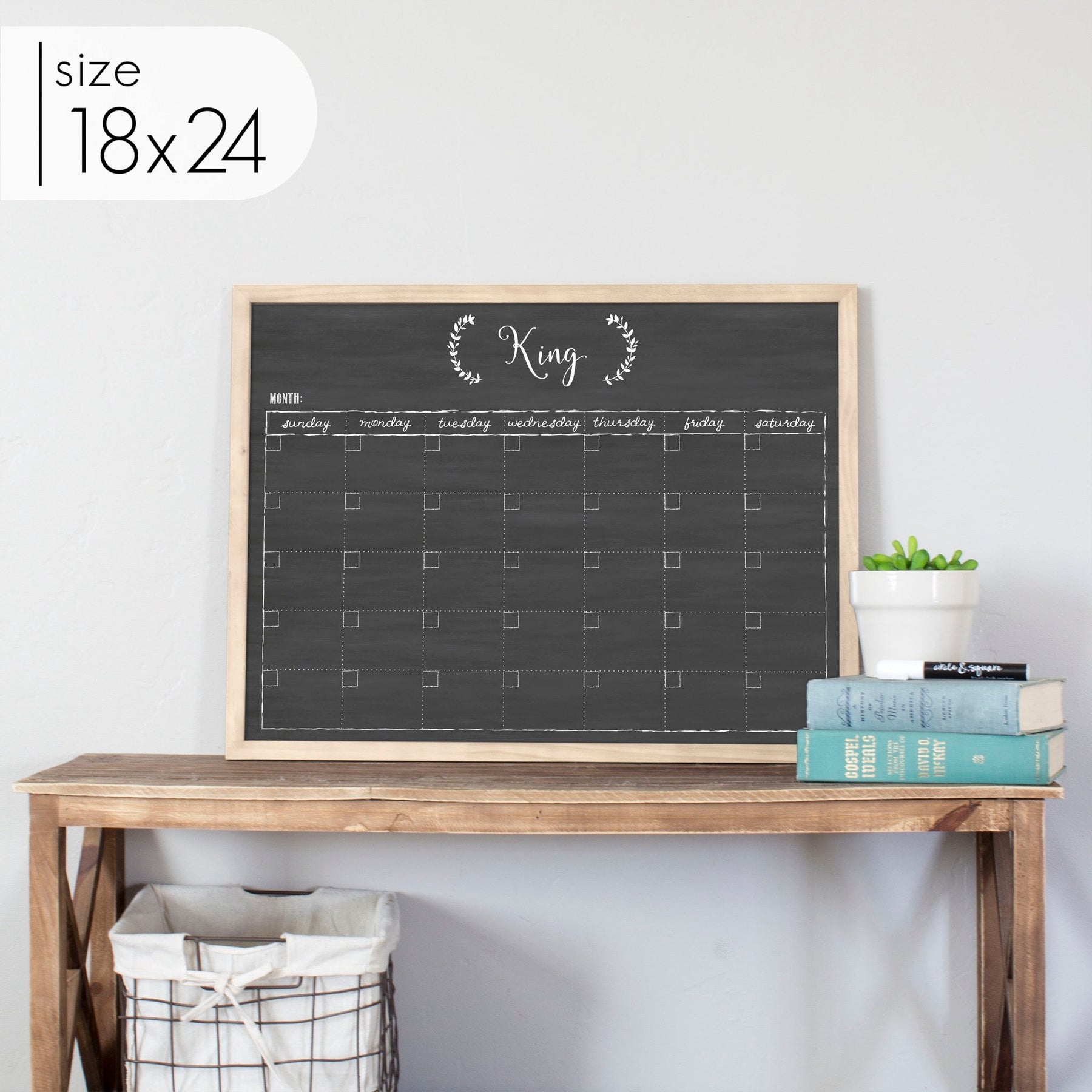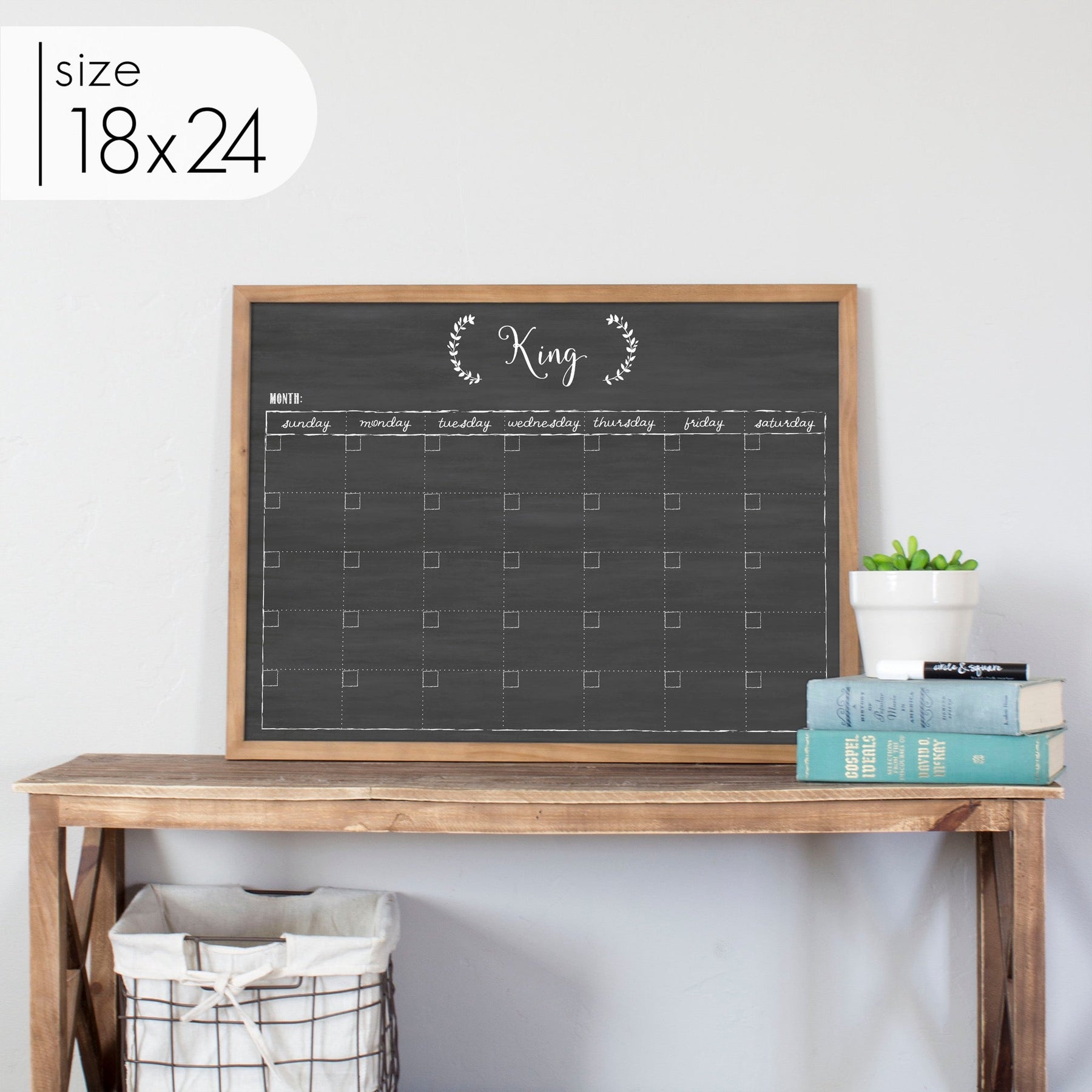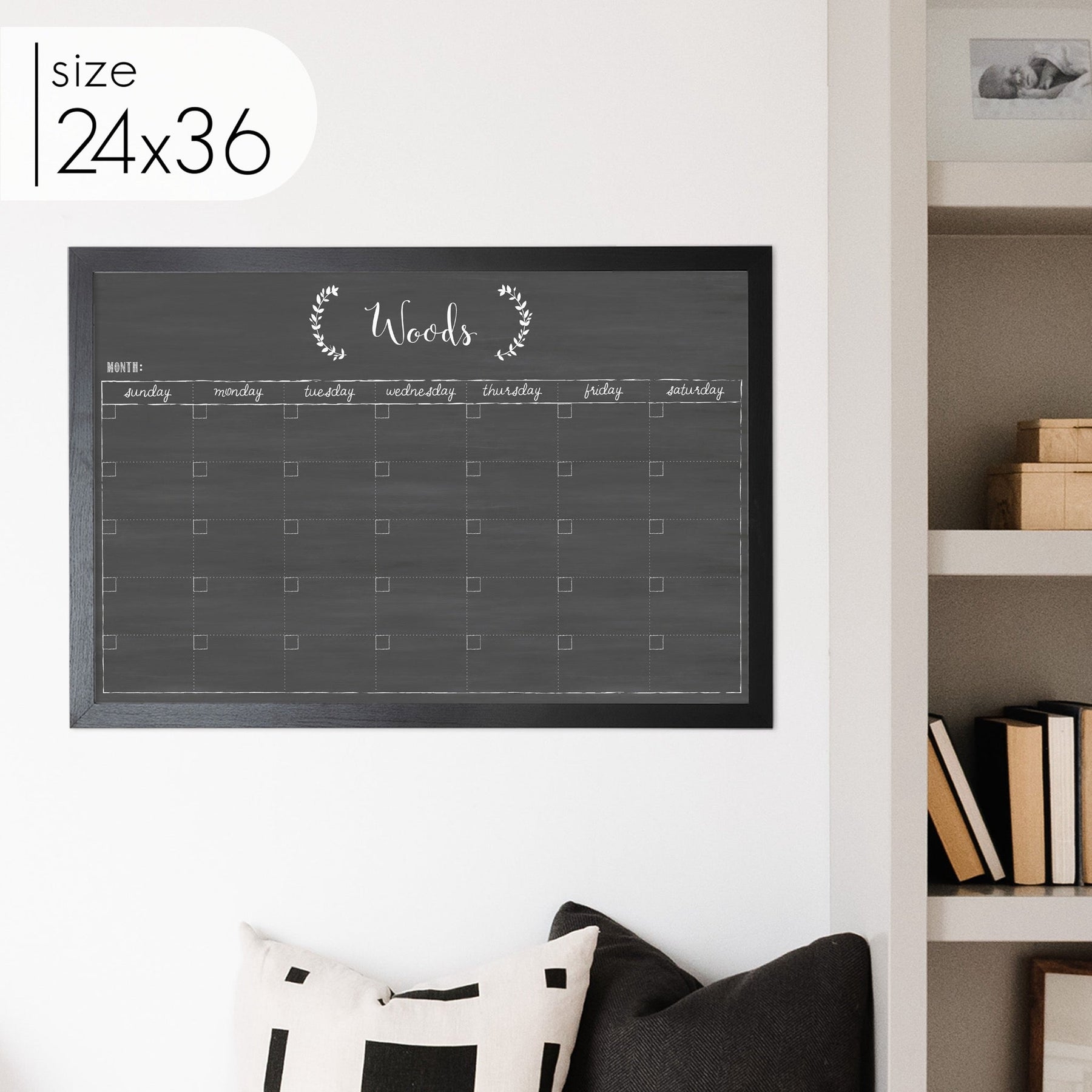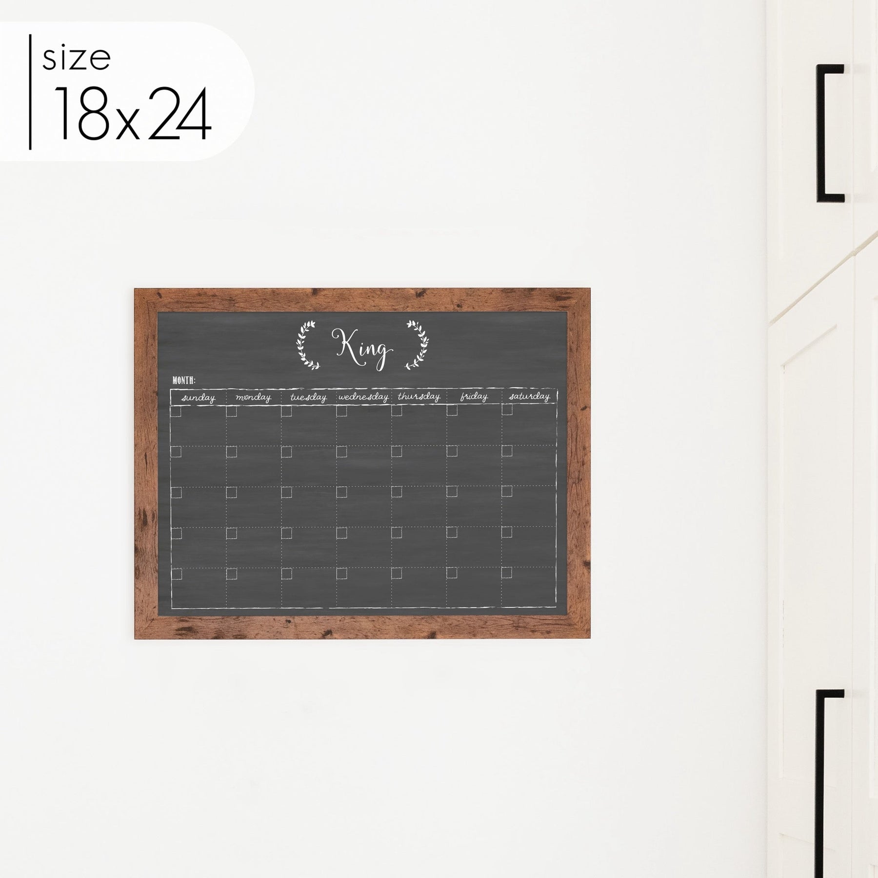 A framed dry-erase monthly calender with a chalkboard look hanging on the wall