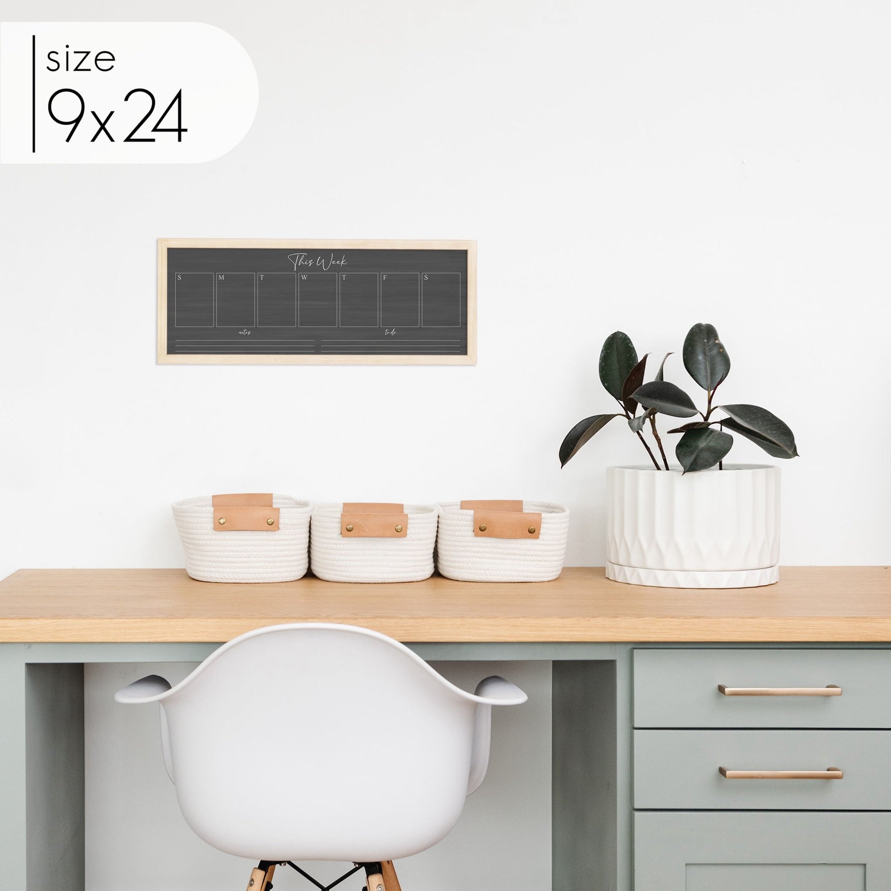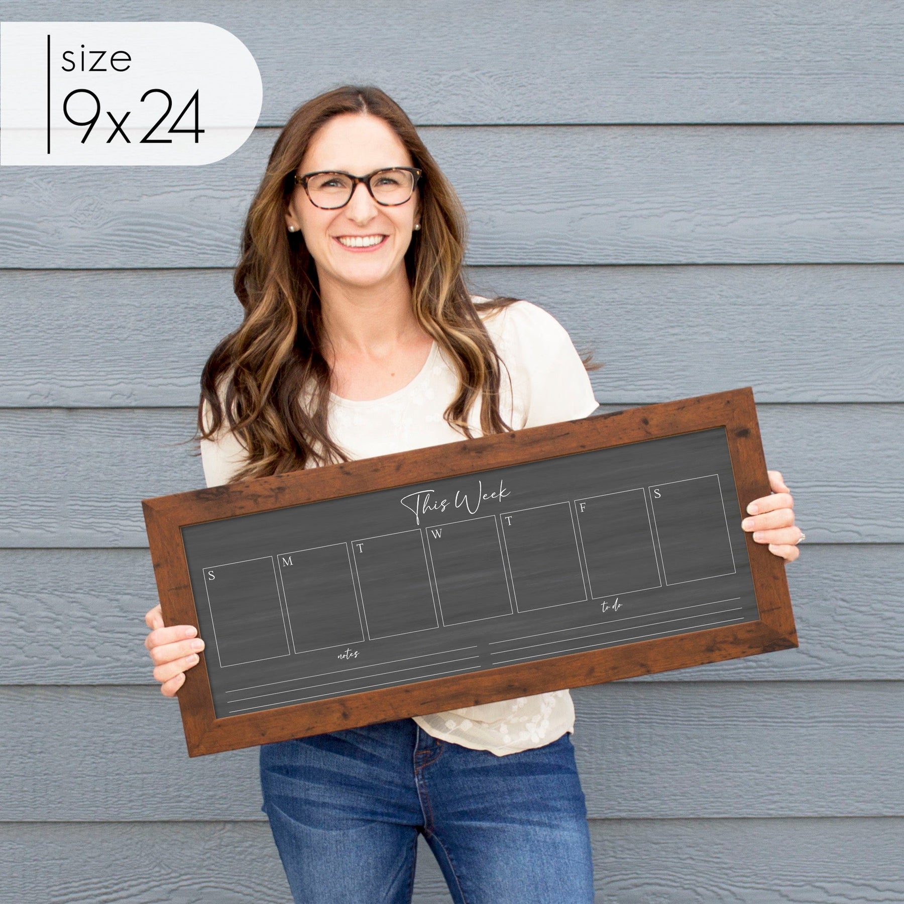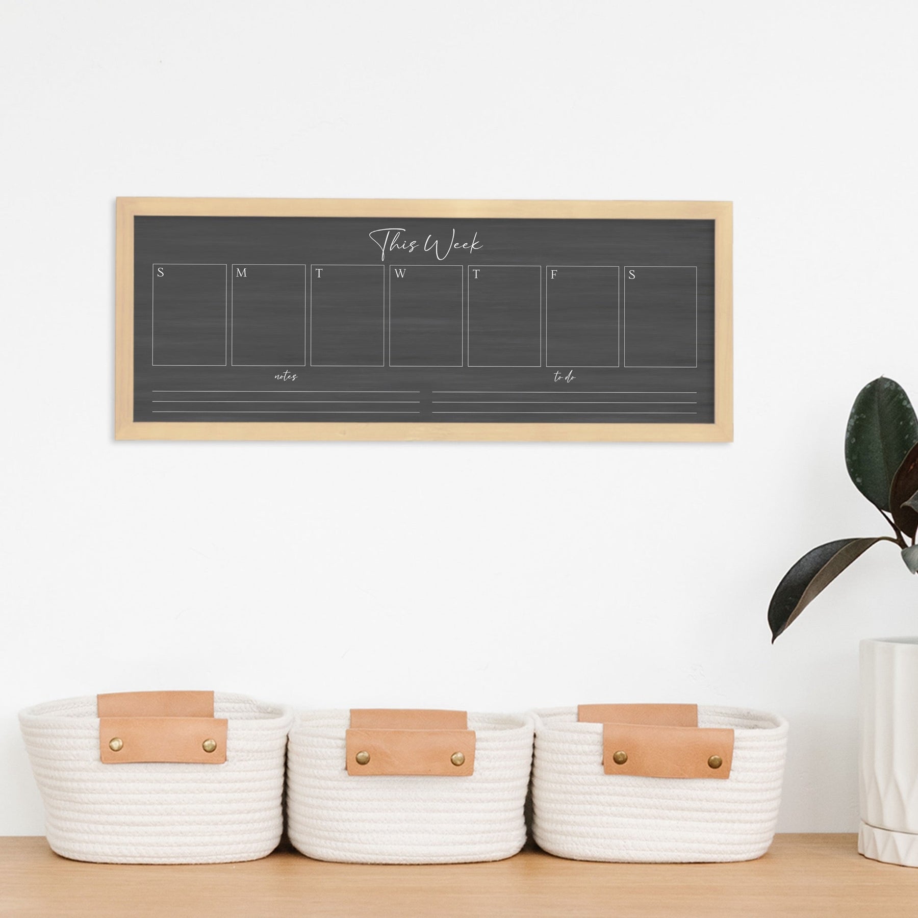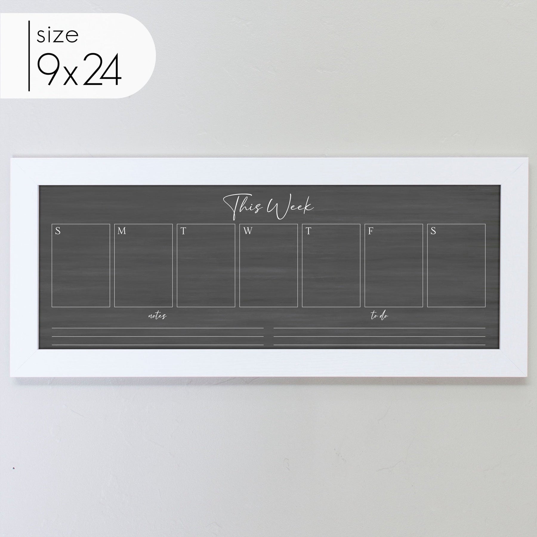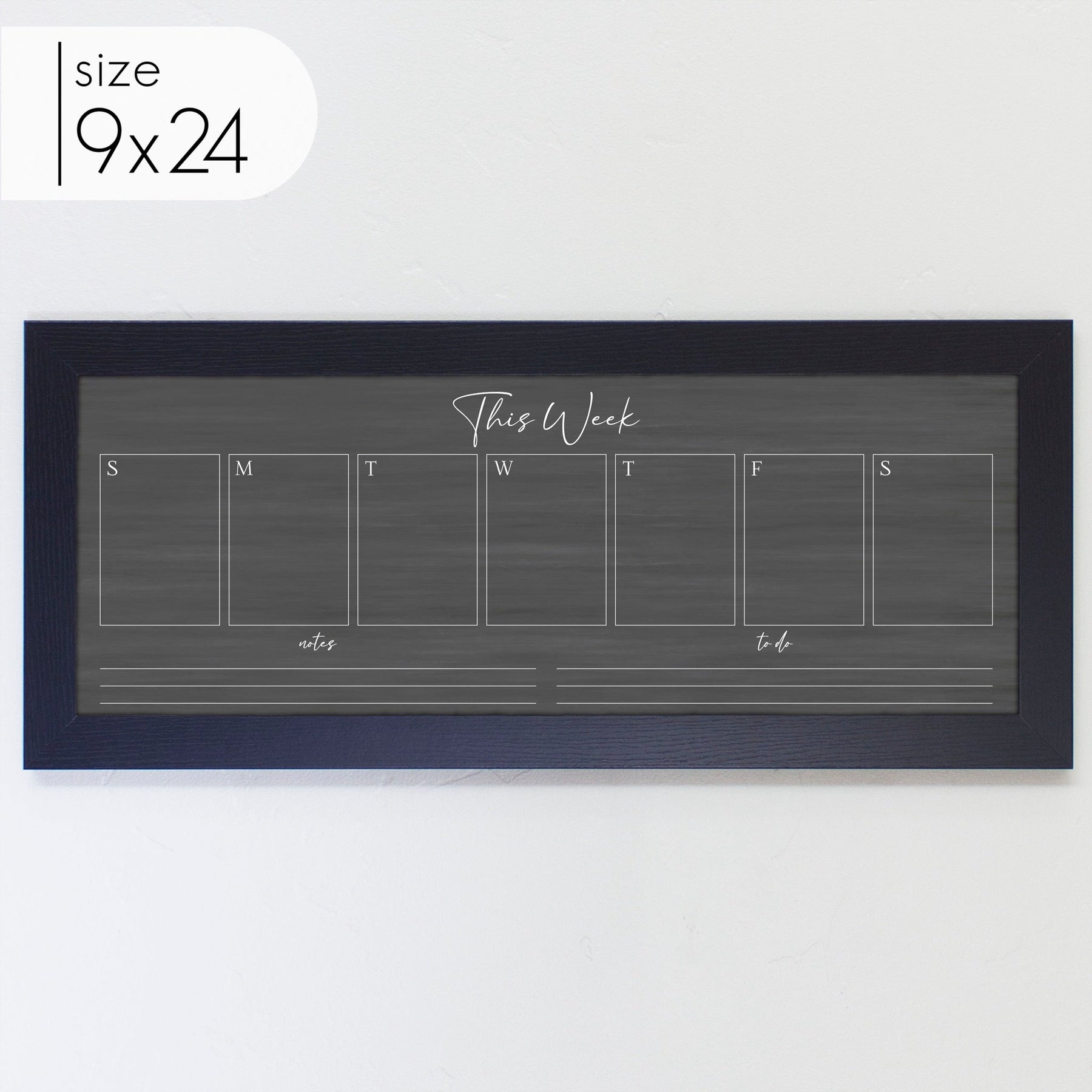 A framed slim dry-erase weekly calender with a faux chalkboard look hanging on the wall