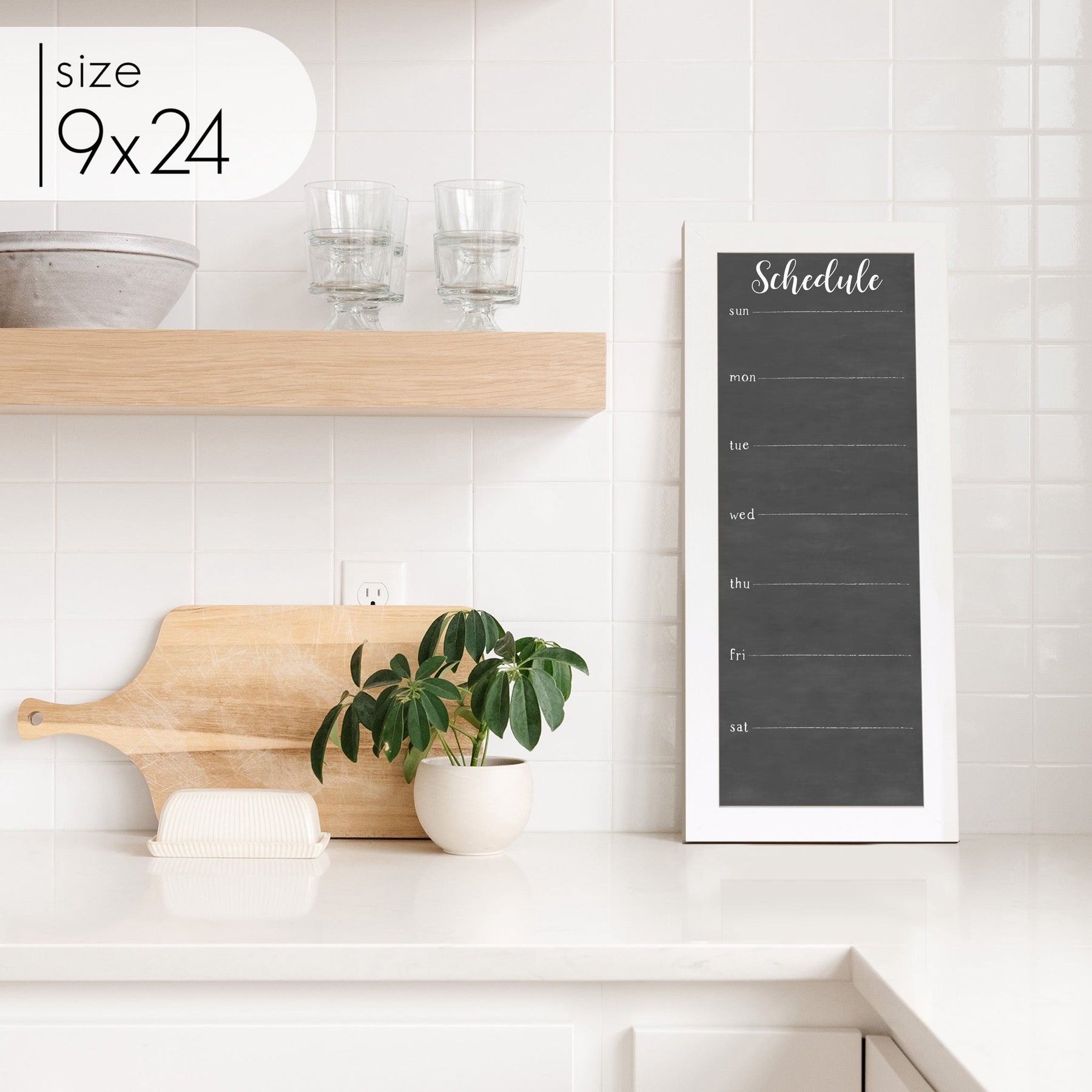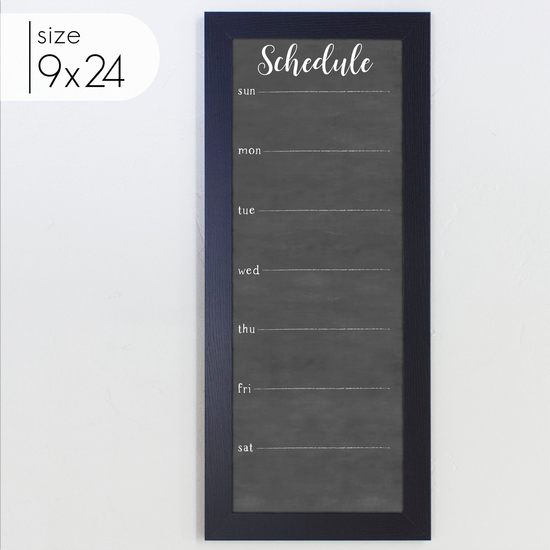 A framed slim dry-erase weekly calender with a faux chalkboard look hanging on the wall
